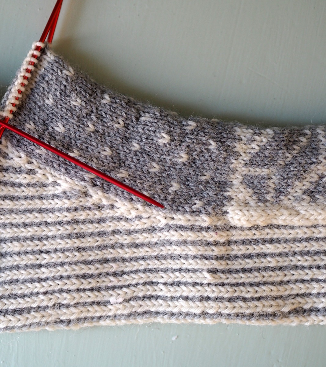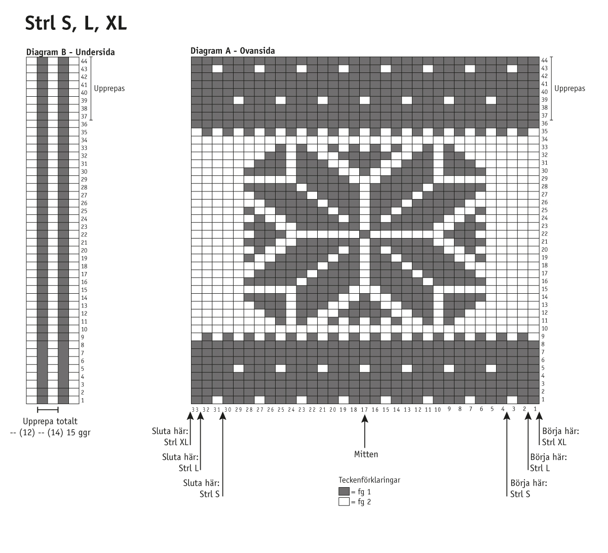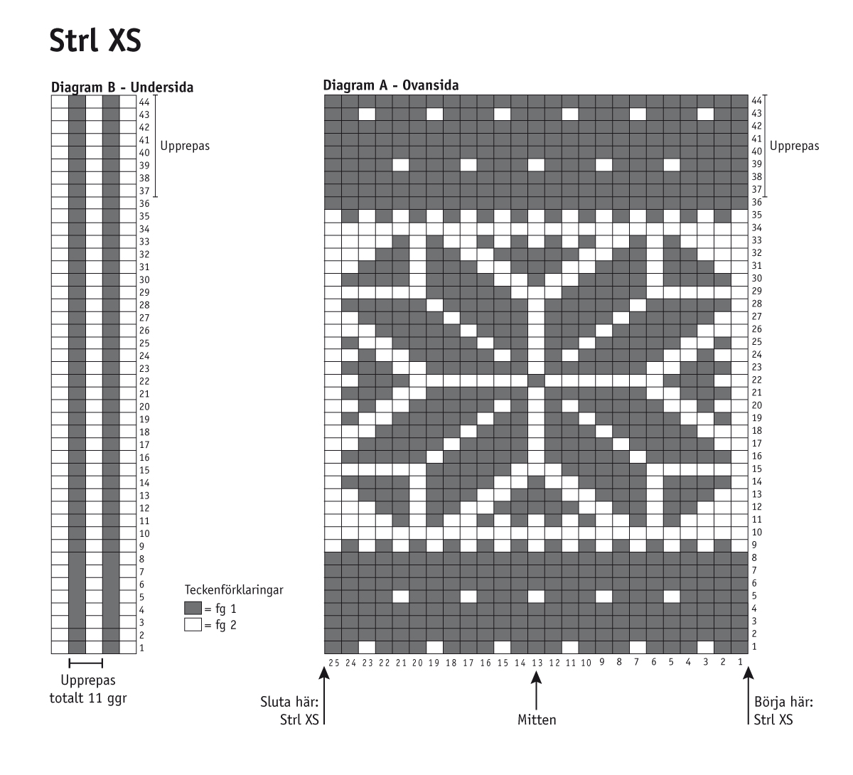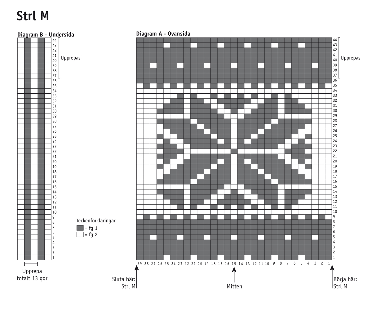 Varv 1: Ovansida: Räta maskor enligt diagram. Undersida: Sticka 1 rm i tidigare randning, öka 1v (gör ökningen i den färg som avviker från följande ordinarie maska, dvs: om följande maska är vit så ska ökningen göras grå och vice versa), sticka rm till 1 m återstår, öka 1h (gör ökningen i den färg som avviker från föregående ordinarie maska, dvs: om föregående maska är vit så ska ökningen göras grå och vice versa), 1 rm.