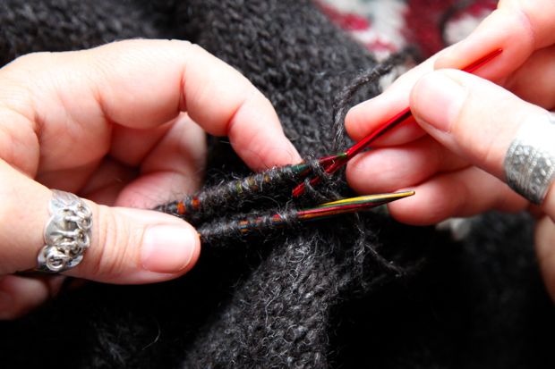 Under ärmarna har du maskor på två trådar, lika många på varje. De ska nu sys ihop med varandra med vad som kallas maskstygn på svenska eller Kirchener stitch på engelska. Det första du ska göra är att föra över maskorna på två strumpstickor.