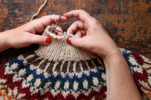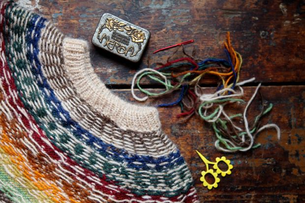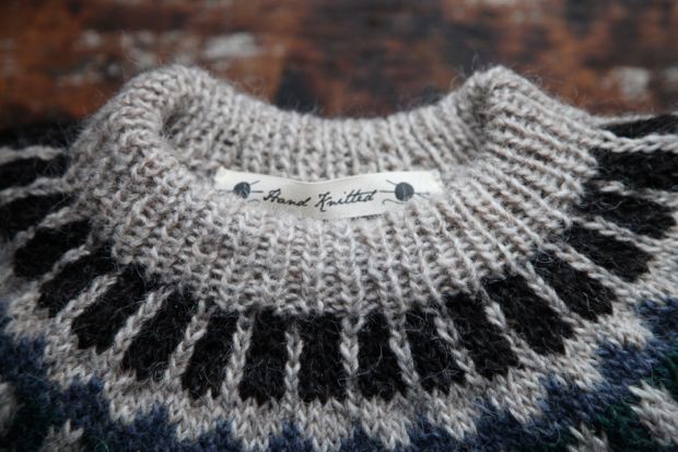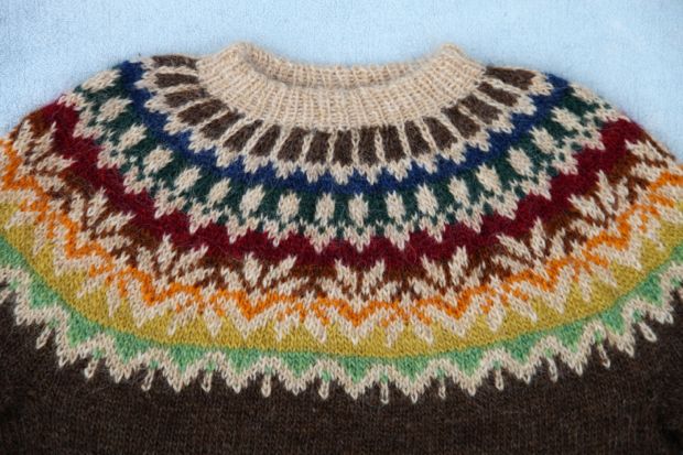 När alla trådar är fästa, halskragen är fastsydd och tröjan är färdig, då ska den tvättas. När du tvättar din Afmaeli kommer den att bli mjukare och flerfärgsstickningen kommer att se mycket jämnare ut.