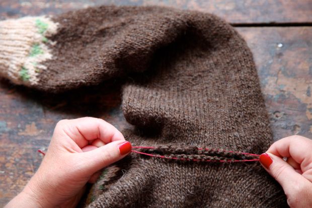 Vänd tröjan ut och in och fäst alla lösa trådar med en stoppnål. Jag brukar fästa med några stygn åt ena hållet och så några åt motsatt håll. Se till att det inte blir tjockt och knöligt och att det inte syns från rätsidan. Sedan är det bara att klippa av tråden. Léttlopigarnet repar inte upp sig utan ullfibrerna hakar i varandra.