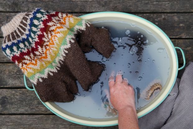 Jag brukar använda en balja där jag löser upp ulltvättmedlet i ljummet, kroppstempererat vatten. Sedan lägger jag ner tröjan och låter den ligga ungefär 10 minuter. Jag kramar ur vattnet och sedan sköljer jag plagget i samma temperatur som tvättvattnet. Det brukar behövas 2-3 sköljningar för att få ett klart sköljvatten. Sedan kramar jag ur vattnet och lägger plagget i en frottéhandduk som också kramas försiktigt.