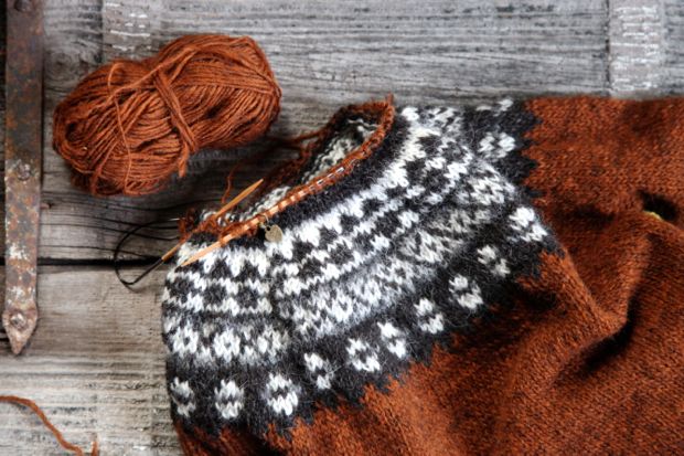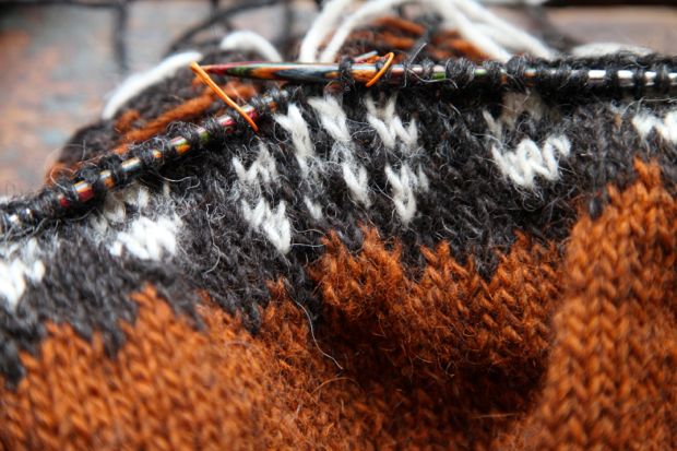 När du stickar med två färger samtidigt finns det olika sätt att hålla i garnet på. Hitta vad som passar dig bäst. Det viktiga är att inte dra för hårt i trådarna på baksidan för att undvika att arbetet drar ihop sig. Det är också viktigt att veta att det garn du håller närmast arbetet är det som blir dominant, d v s den färgen kommer att framträda mest. Bestäm vilken färg du vill ska vara mest framträdande och var konsekvent med hur du håller garnerna. Om det är mer än 3-5 maskor mellan färgerna kan det vara bra att vrida trådarna bakom arbetet, ungefär var tredje maska. Det viktiga är att garnet inte blir för spänt på baksidan. På denna tröjan är det inte så många maskor av varje färg så jag snor inga trådar på baksidan, jag försöker bara hålla garnet jämnt spänt och ganska löst. Om du bara inte stickat för hårt så att oket dras ihop av trådarna på baksidan så brukar eventuella ojämnheter i mönsterstickningen jämna ut sig när du senare tvättar tröjan.
