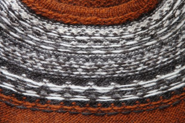 På bilden ovan ser du att jag har stickat förkortade varv i både den svartgrå färgen och i den rostbruna.