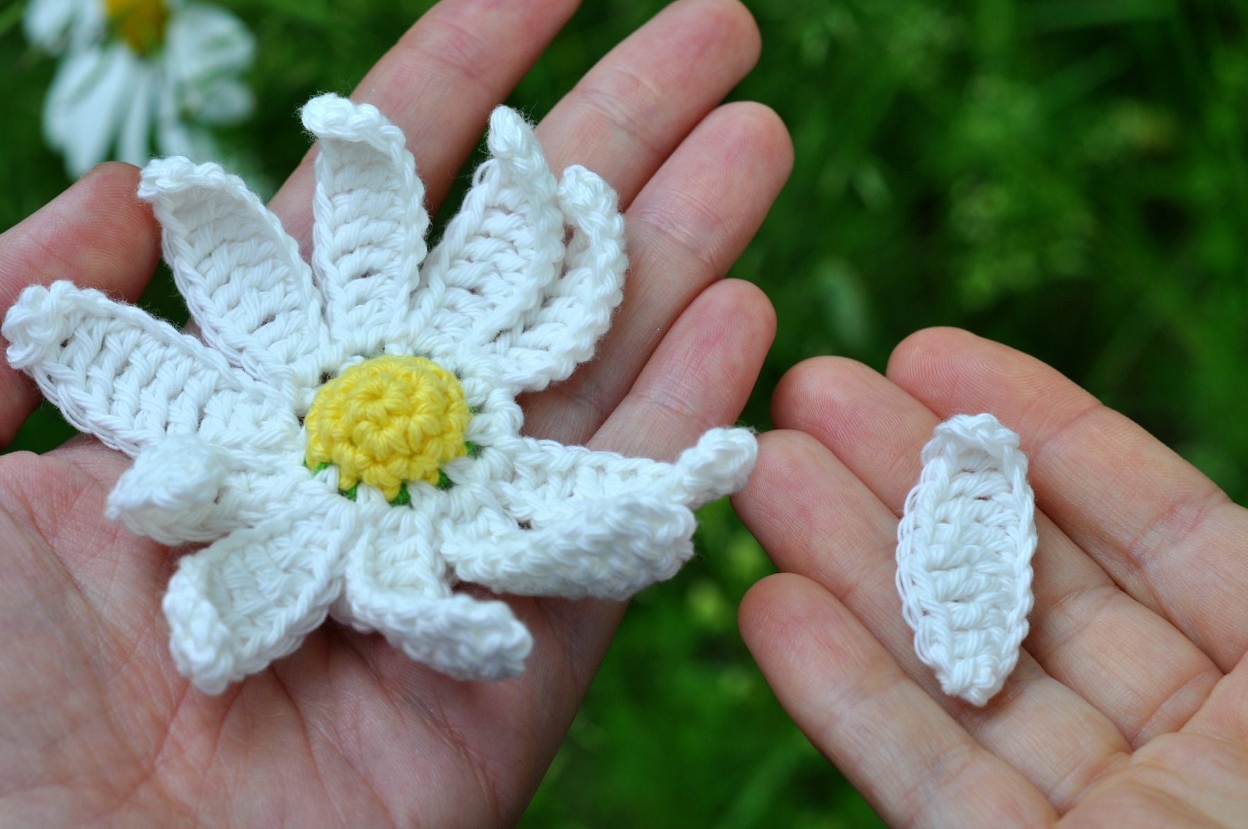 *Gör 11 lm, vänd och virka 1 hst med nedtag i 2:a m från nålen, 2 st, 4 dst, 2 st, 1 hst, 1 fm i nästa m i skarven mellan gult och grönt på blommans mitt.* Upprepa från *-* ytterligare 10 ggr.