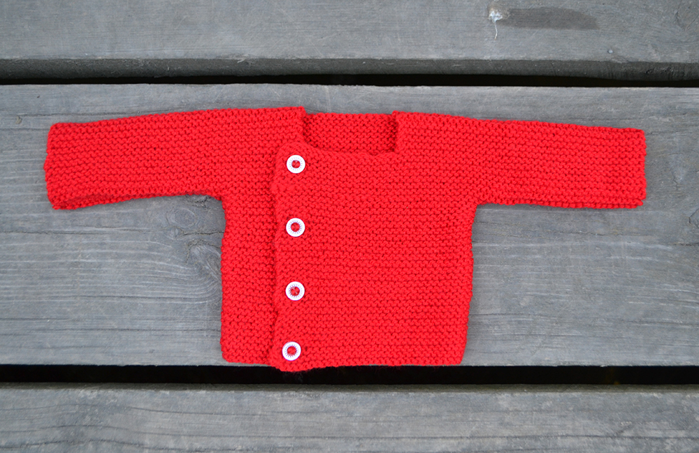 Det är en mycket enkel modell som hämtar sin form och sina mått från Petras lilla tröja, en modell i boken Sticka & skicka, och Kristbergskoftan, som Elin har hittat på och som finns i boken Garnglädje. Skillnaden är helt enkelt att jag har gjort en kofta där ena framstycket går rakt ner från halsringningen medan det andra sträcker sig förbi mitten. Jämfört med Petras tröja är den också lite annorlunda genom att uppläggningskanten hamnar bak istället för fram. Styckena är helt raka. Ja, enklare kan det nästan inte bli, eller hur?