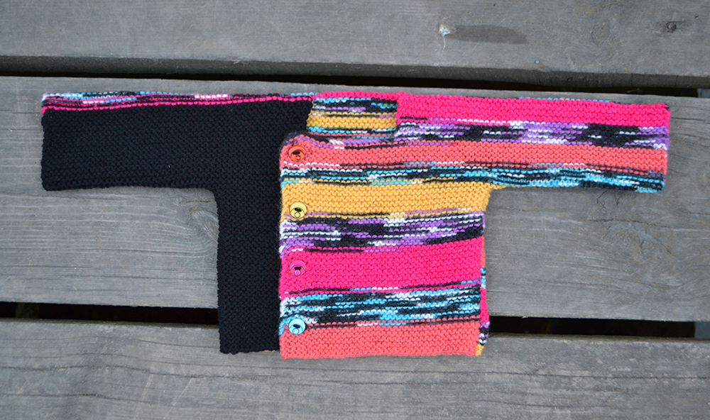 På andra sidan, sticka de 39 (44) (48) m i 4 cm och lägg sedan upp 18 (19) (20) m på den sida som inte är ärmen – detta blir det breda framstycket. Sticka fram och tillbaka.