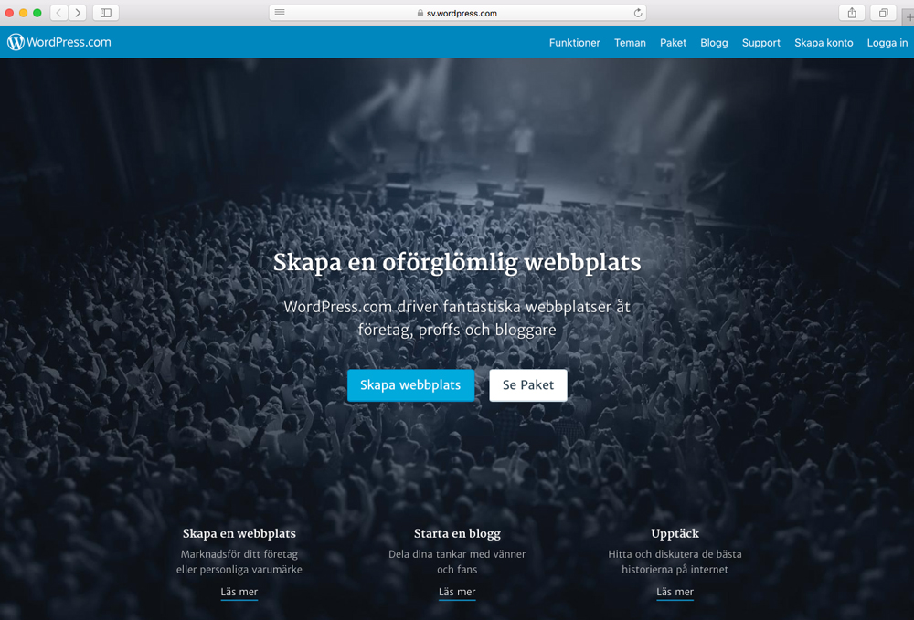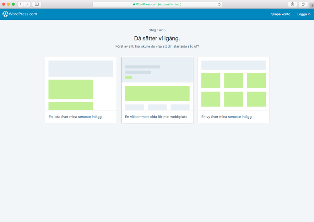 Först och främst tar du dig in på WordPress hemsida > https://sv.wordpress.com/. Väl där klickar du på ”Skapa webbplats”. Då kommer du till en sida som ser ut såhär: