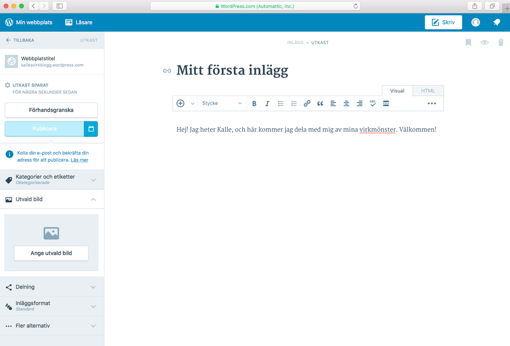 Detta gör ni genom att bara klicka på ”Publicera” under där det står ”Förhandsgranska”. Om ni ännu inte bekräftat ert konto så kommer ni få stopp här, men då är det bara att ni letar på WordPress-mailet i er mailinkorg och klickar på aktiveringslänken. Om ni inte hinner skriva klart behöver ni inte vara rädda för att gå ur sidan och logga in igen, WordPress sparar automatiskt ett utkast av allt ni skriver! Hursomhelst, nu är det dags att kika in vårt inlägg, så klicka bara på ”Visa inlägg”: