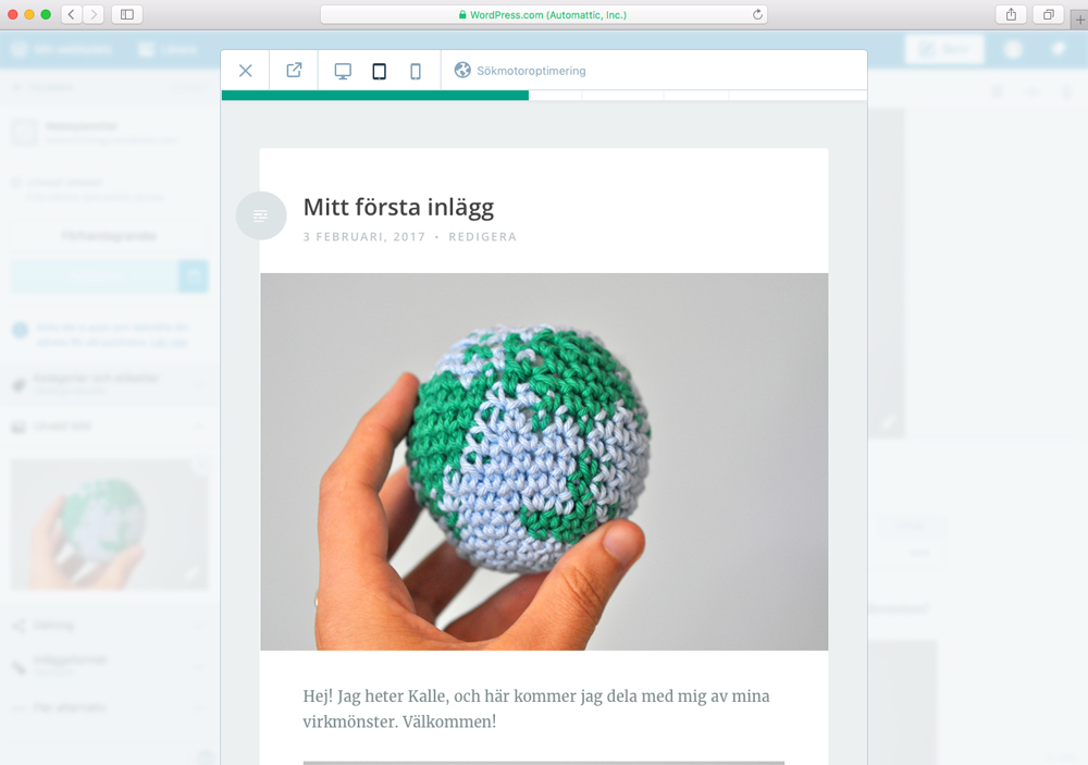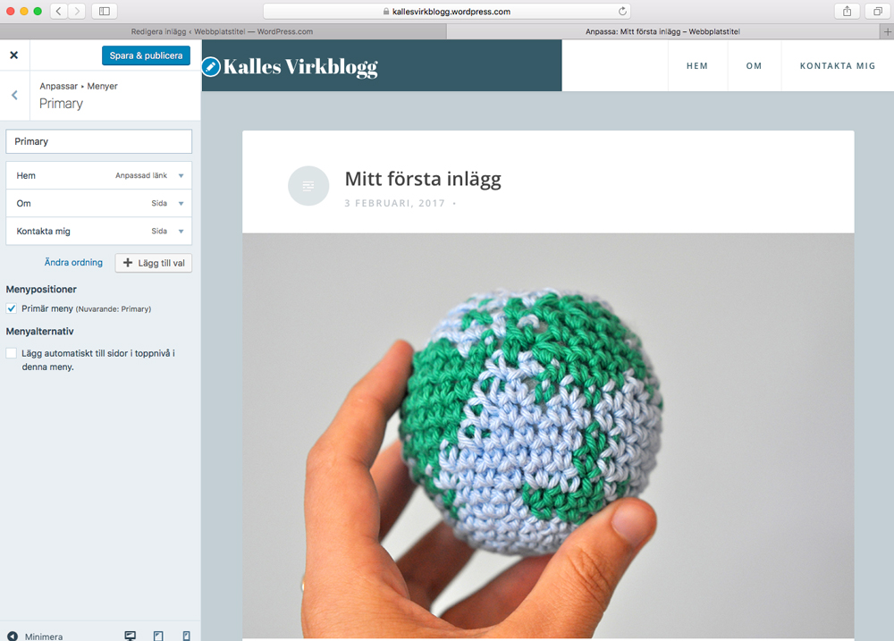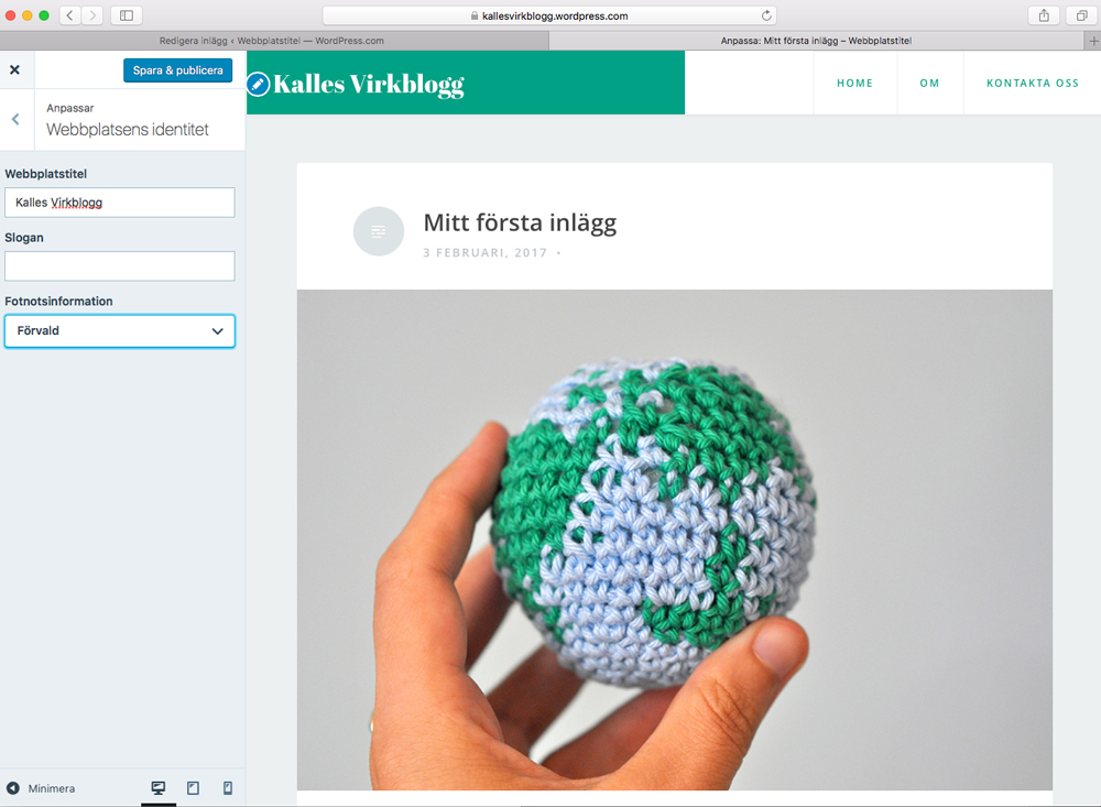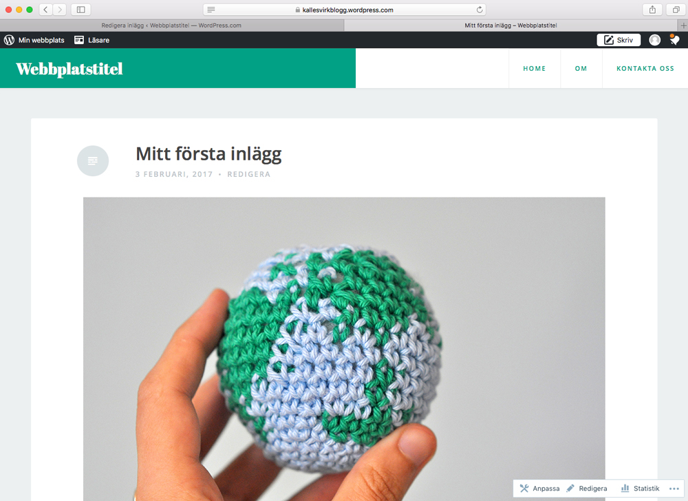 Här har vi det, vårt första blogginlägg! Visst är det fint? Jag lägger dock märke till att det står ”Webbplatstitel” längst upp till vänster, och bestämmer mig för att piffa till sidan något: