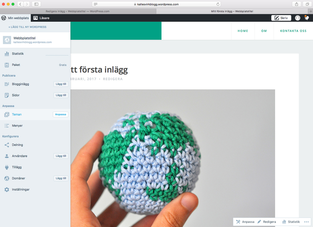 För att få fram sidomenyn klickar du bara på ”Min webbplats” längst upp till vänster. Sen väljer du ”Anpassa” strax till höger om ”Teman”. Då kommer vi hit..