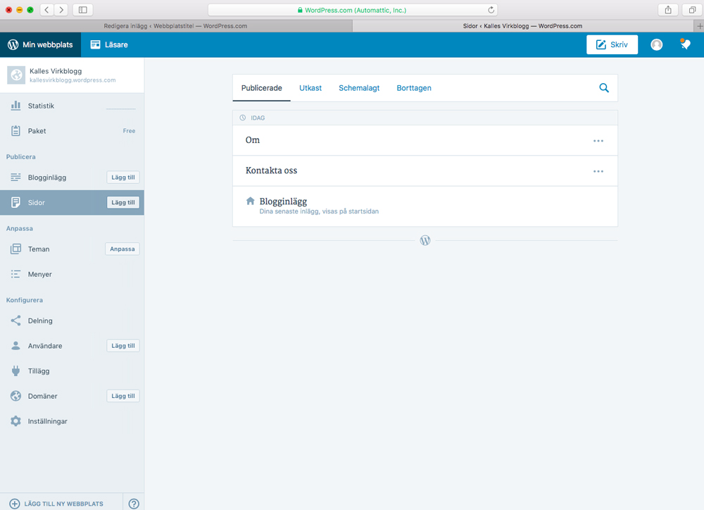 Till min startsida! Såhär ser det alltså ut när besökarna kommer till min alldeles egna blogg (se för er själva på https://kallesvirkblogg.wordpress.com/). Här kan vi vara nöjda om vi vill, men jag tänkte visa några saker till. Klicka fram menyn genom ”Min webbplats” uppe till vänster, och välj ”Sidor”: