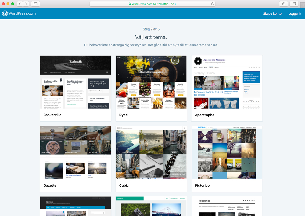 Här väljer du ett utseende (eller tema) som du gillar. Själv tog jag det som heter ”Revelar”, eftersom det föll mig i smaken. Självklart är även detta något som du kan ändra i efterhand! Iallafall, när du hittar ett tema som du gillar är det bara att du klickar på ”Välj”, vilket tar oss till följande sida: