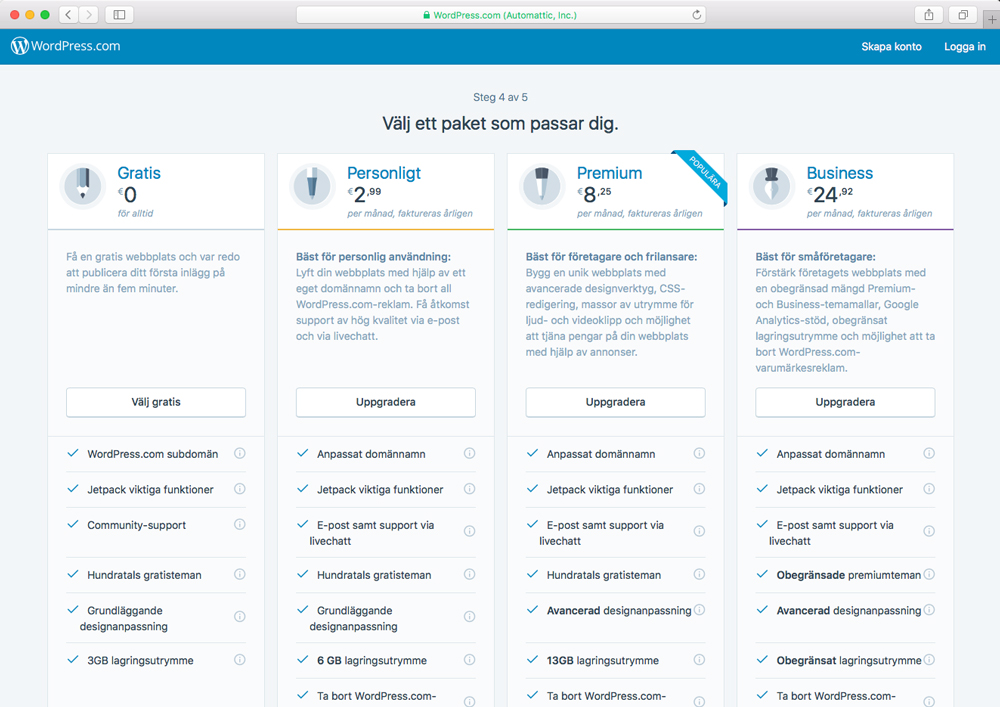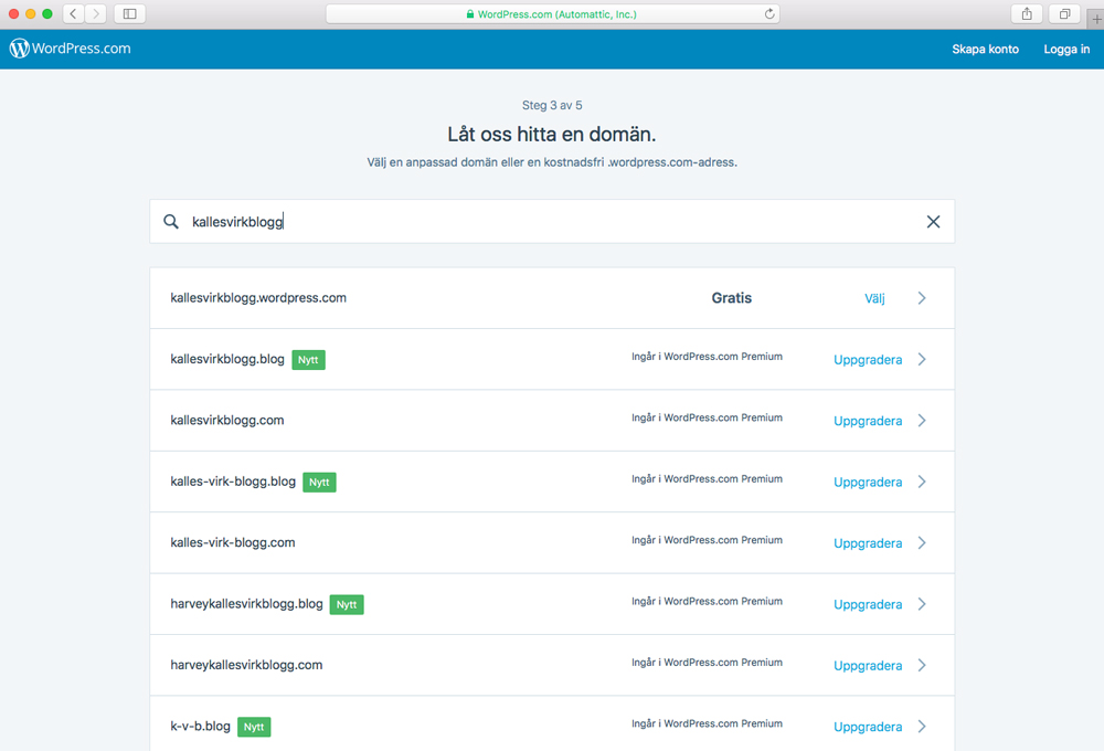 Nu är det dags att hitta på ett namn, eller domännamn, till bloggen! Detta blir även adressen som besökarna får skriva in när de vill besöka din blogg. Här kan du få prova lite olika namn innan du hittar något som är ledigt. Själv nöjde jag mig med ”kallesvirkblogg”, eftersom jag är en hejare på luftmaskor! När du bestämt dig för ett domännamn som du är nöjd med klickar du bara på ”Välj” till höger om där det står ”Gratis”, vilket tar oss hit:
