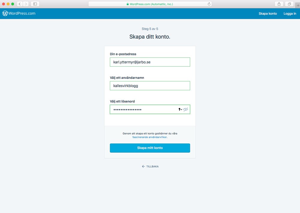 Nu är det dags att skapa vårt konto på WordPress! För att göra detta krävs det att du har en mailadress. Om du saknar det kan jag tipsa om Gmail, som är ett bra gratisalternativ > https://www.google.com/gmail/. Hur som haver, när du fyllt i din mailadress, valt ett användarnamn (jag tog samma som bloggnamnet) och hittat på ett lösenord så klickar du bara på ”Skapa mitt konto”, och voila: