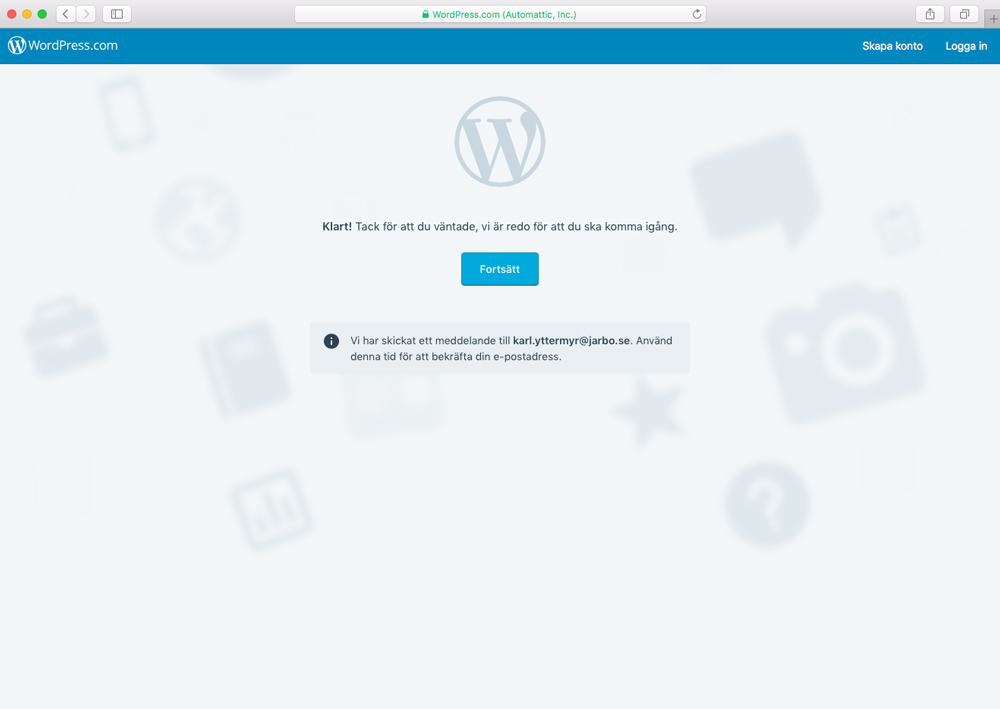 Vi är färdiga att börja blogga! Innan du klickar på ”Fortsätt” här kan det vara smart att gå till din mailinkorg och leta på mailet från WordPress, där du hittar en länk som du klickar på för att aktivera kontot. Detta krävs för att du ska kunna publicera dina inlägg, vilket jag upptäckte när jag väl skulle publicera mitt första… Hursomhelst, när du känner dig redo klickar du bara på ”Fortsätt”, vilket tar oss hit: