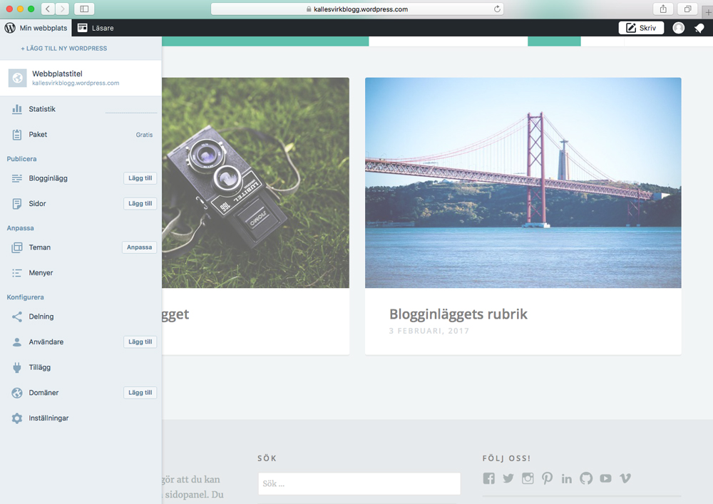 Här kan du ändra dina sidor, alltså de ”fasta” inlägg som syns i menyn. Kanske skriver du en kortare text om dig själv och lägger in en bild under ”Om”, och lägger till din mailadress under ”Kontakta oss”. Valet är ditt!
