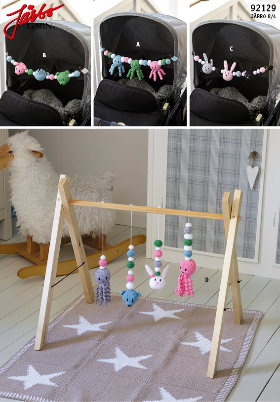 Nu fattas bara några fina virkade figurer! Vill man kan man borra hål i rundstaven där figurerna ska sitta annars går det lika bra att knyta runt rundstaven!