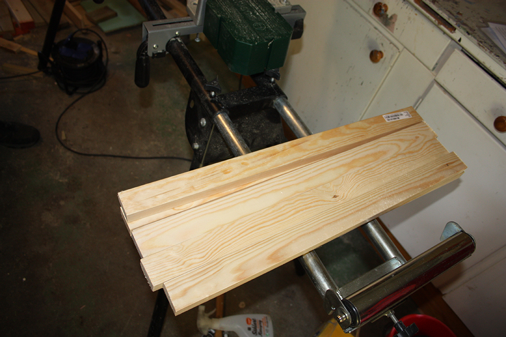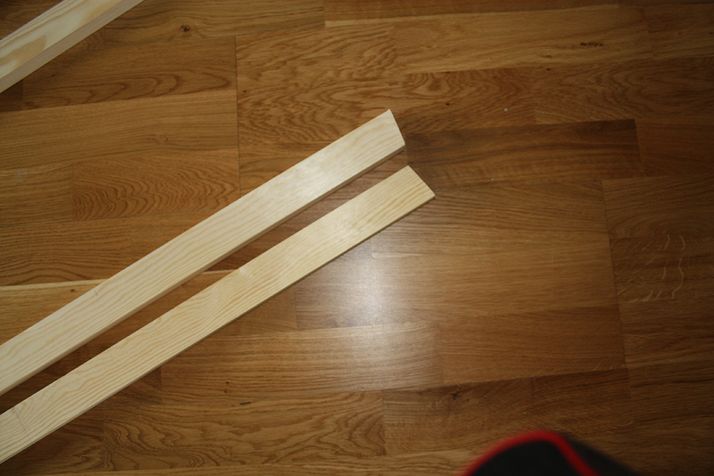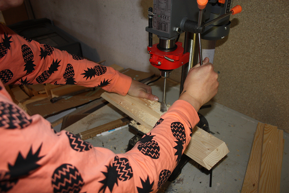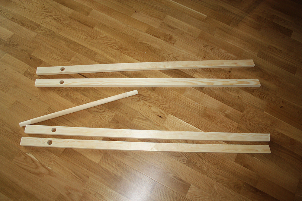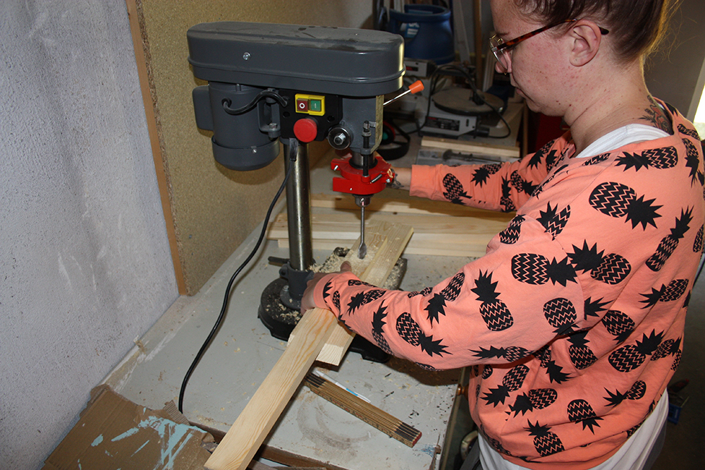 Börja med att kapa till trälisterna, mina är 60cm långa. Mät och markera sedan ut vart rundstaven ska sitta, ungefär 15cm ner. Jag använde en pelarborr men det går lika bra med skruvdragare och en hållborr i samma storlek som rundstaven.