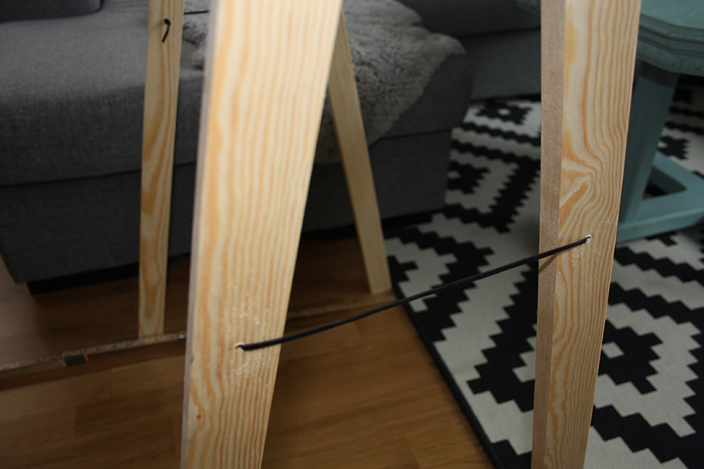 För att babygymmet inte ska glida isär eller lossna från rundstaven, fäste jag konstruktionen med en träplugg på varje sida, i listen som sitter ytterst. Jag använde skruvdragaren och borrade ett hål genom listen och en bra bit in i rundstaven, där jag slutligen satt i en träplugg. Det håller listerna på plats och babygymmet blir stadigt.