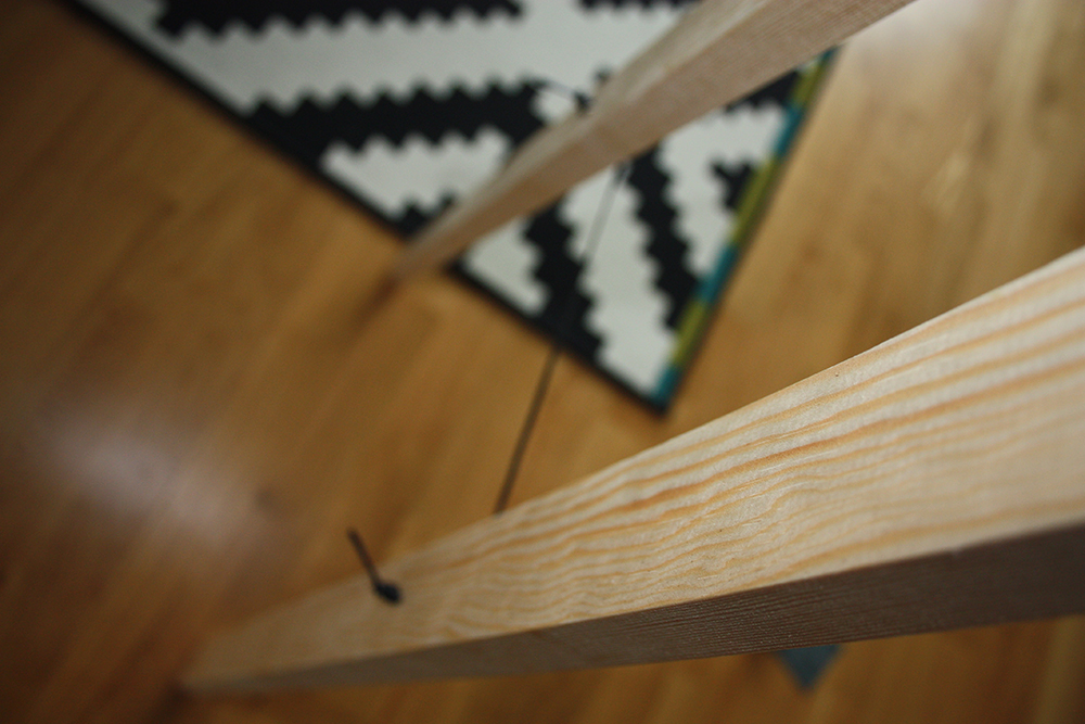 Bestäm hur brett du vill ha mellan listerna, ju bredare, desto lägre babygym. När måttet är bestämt är det dags att göra hål för läderbandet, jag valde ungefär i mitten på listen. Slipa till om det behövs annars är det bara att trä in banden och knyta.
