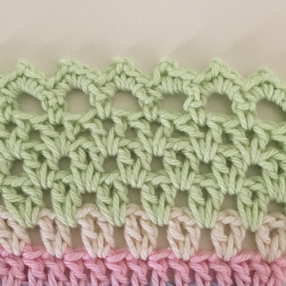 V4. Om varje lmb mellan st-grupperna virkas 1fm, därefter 4lm 1 fm i nästa lmb 4lm osv….om varje hörn lmb virkas det (1st 5lm 1st )