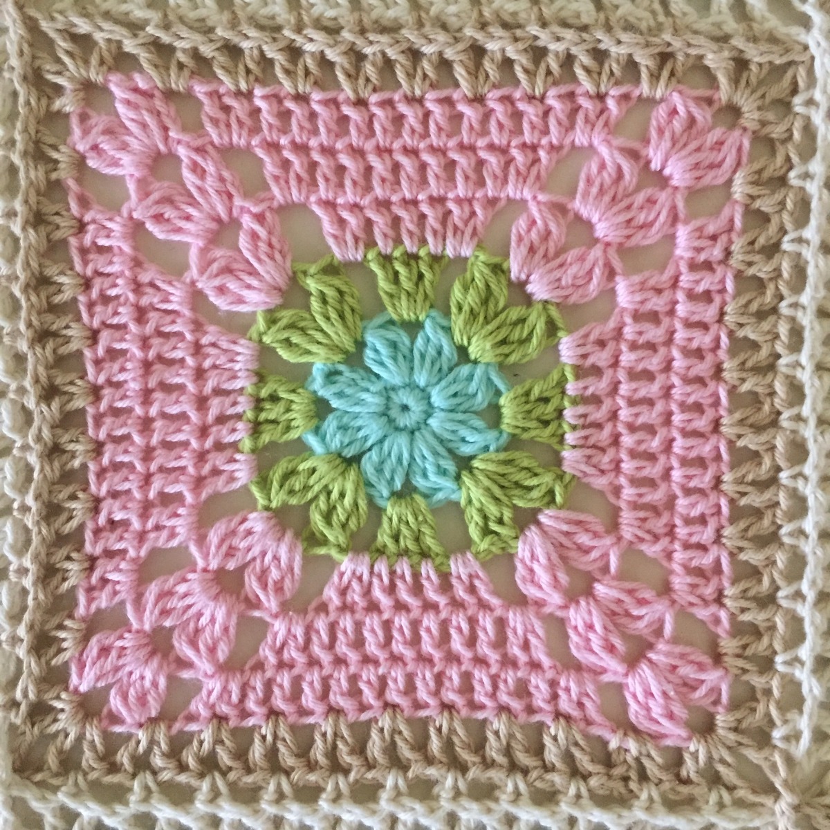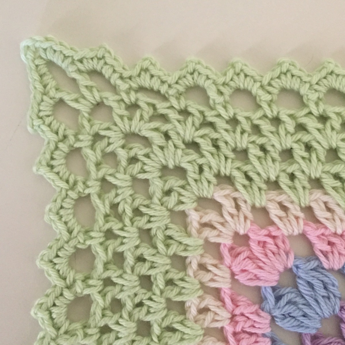 V1-3. Börja i ett hörn. *(1st 1lm 1st 3lm 1st 1lm 1st) om samma lmb (=hörnet) virka sedan ( 1st 1lm 1st ) mellan varje st-grupp fram till nästa hörn* upprepa *__* varvet runt, avsluta varvet med en sm i första st.