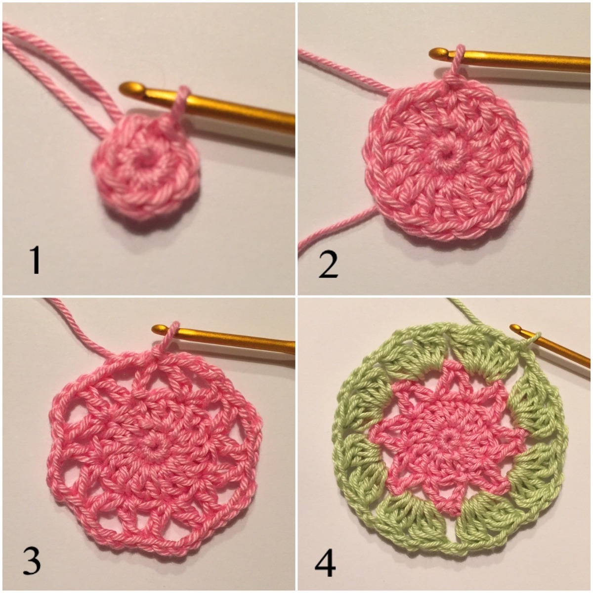V1. 8fm i en magisk ring, eller virka 5lm och slut till en ring och virka 8fm om ringen. Avsluta varvet med 1:sm i 1:a fm.