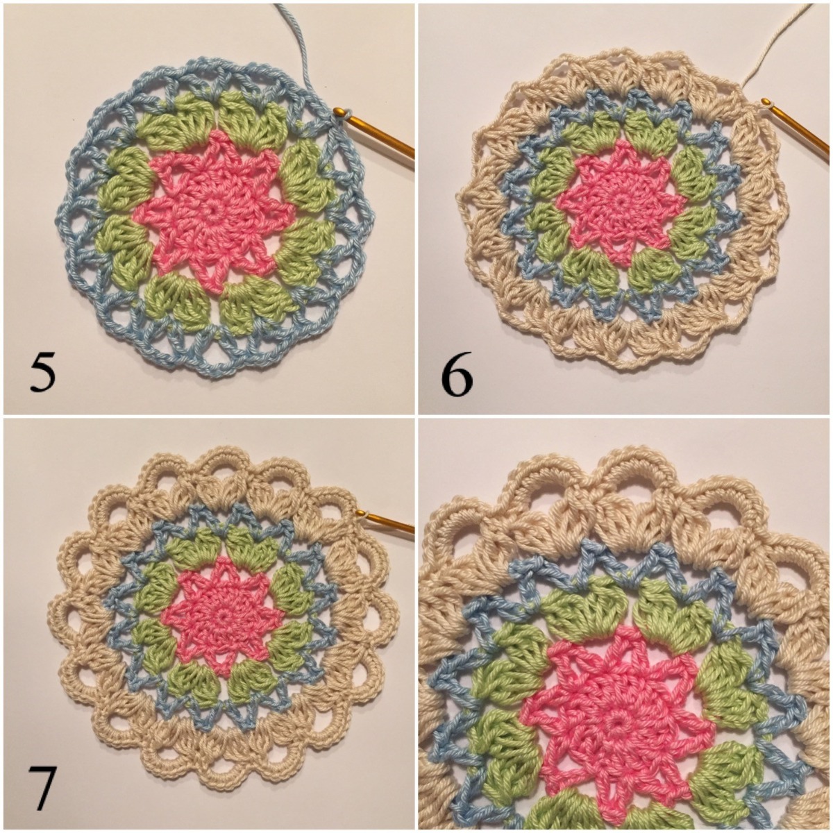 V7. *8fm i lmb, 1fm mellan st-gruppen* upprepa *__* varvet runt. Avsluta varvet med 1sm i 1:a fm.