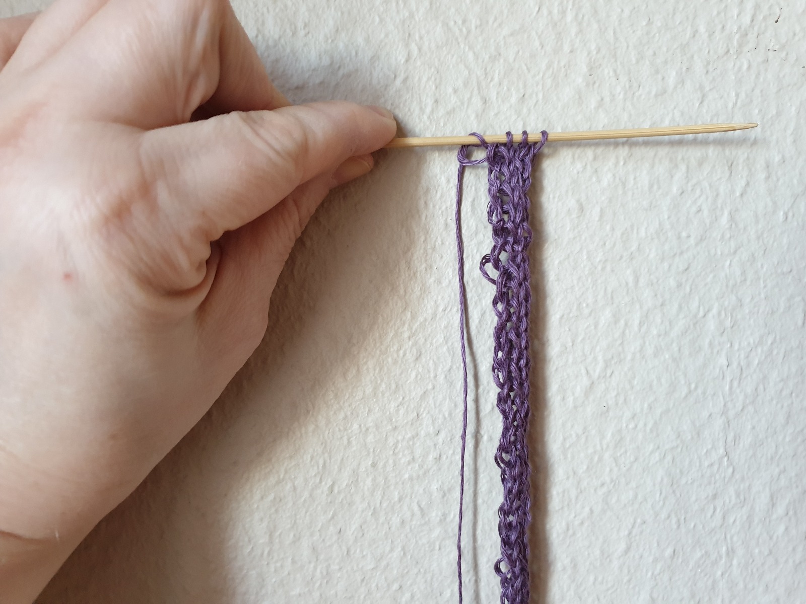 Nu ska vi plocka upp maskor längs med i-corden, närmare bestämt en maska i varje varv.