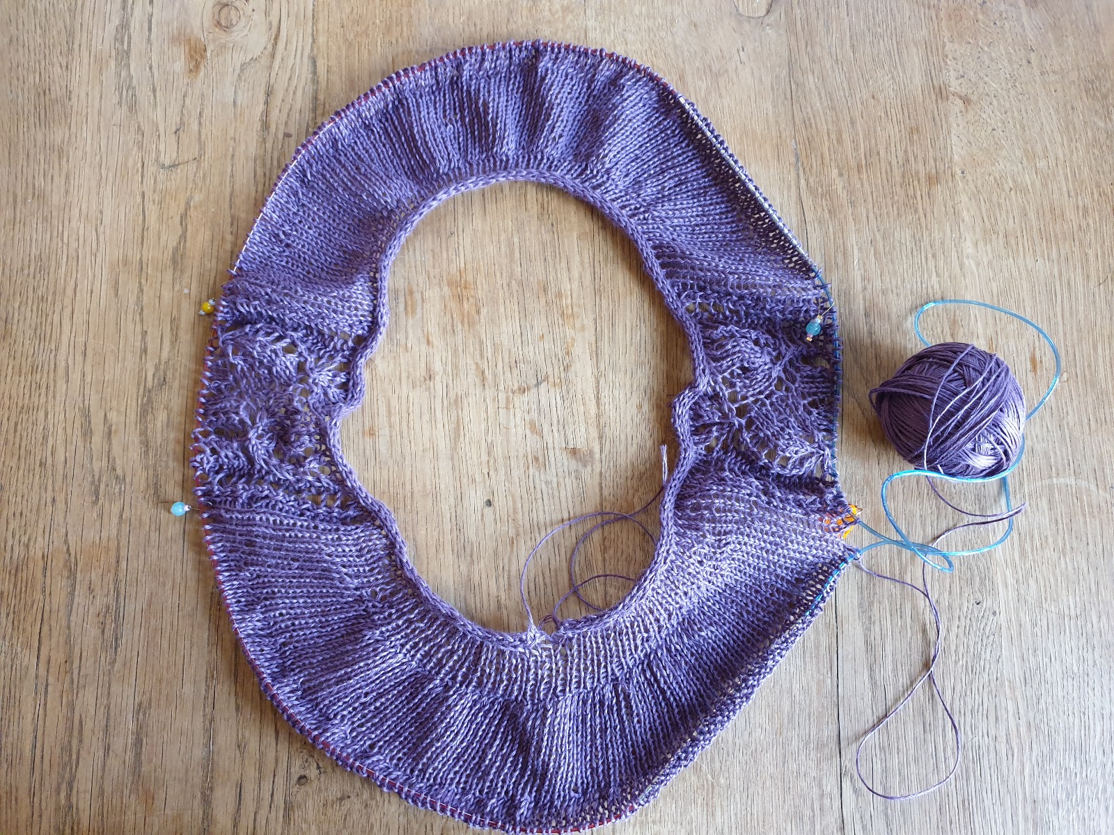 Nu är det äntligen dags att sätta markörer för spetsstickningen på ärmarna och börja sticka från diagrammet och komma igång med oket på allvar.