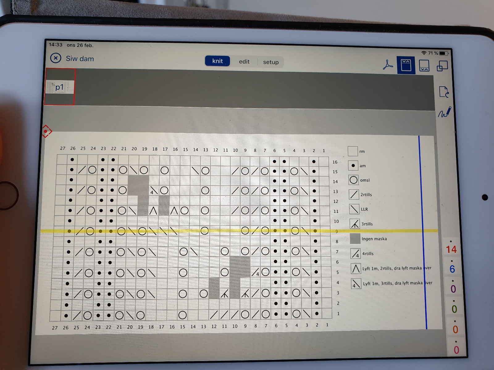 Alla har sina egna favoritmetoder för att hålla koll på var man befinner sig i diagrammet, utskrifter med post-its är vanligt. Själv använder jag en app som heter KnitCompanion för att läsa diagram. Appen är gratis och finns både för Android och Iphone (du kan betala och få extra funktioner men det gör inte jag). I appen finns det varvräknare så att du bara klickar varje gång du repeterar ett varv och då enkelt vet hur många repetitioner du har kvar (du ser dem längst ner till höger i bilden nedan), som när du ska repeterera varv 1 flera gånger. Det finns också en gul horisontell linje som lätt går att flytta och markera var du är och nästa gång du öppnar appen så är den där du lämnade den och du behöver aldrig riskera att tappa bort dig. Jag använder en ipad/surfplatta som har något större skärm än en telefon, men appen funkar så klart på båda alternativen. Alla mönster finns som PDFer i Facebookgruppen. Här kan ni se hur det ser ut när jag använder KnitCompanion: