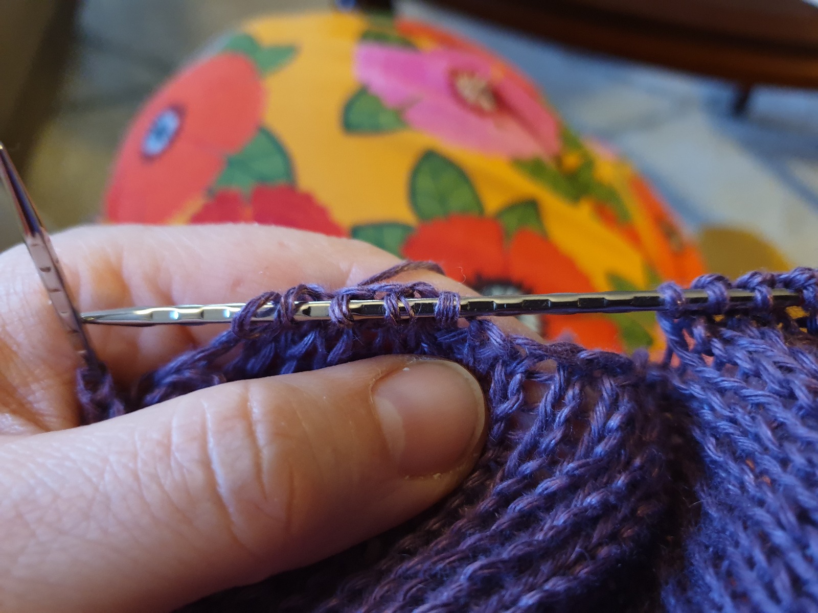 Sedan använder jag Maja Karlssons tips om hur man får bort gliporna på varje sida genom att plocka upp en extra maska och sticka ihop med nästa ordinarie maska, här kan du se på videon hur man gör: