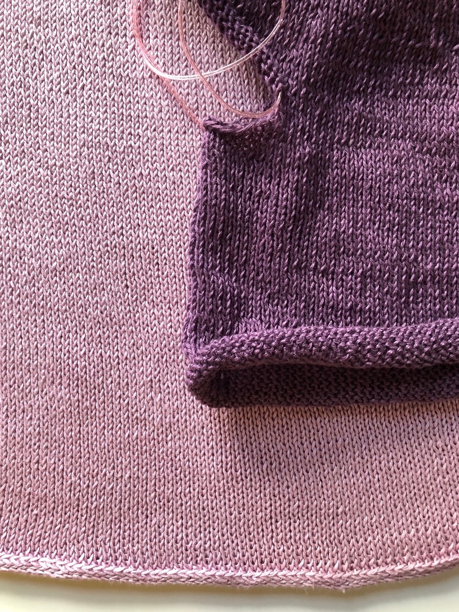 Sy ihop alla i-cords mellan upplägg och avmaskning innan du fäster dessa ändar. Jag sydde ihop dem med madrasstygn. Fäst alla ändar. De ändar som är mitt på tröjan fäster du vertikalt så de inte syns genom det något genomskinliga tyget. På oket syr du in ändarna längs med kanten på ärmen, eller på insidan av ärmen längs med i-cord-kanten. Du kan eventuellt behöva sy lite under ärmarna också innan du fäster de trådarna.