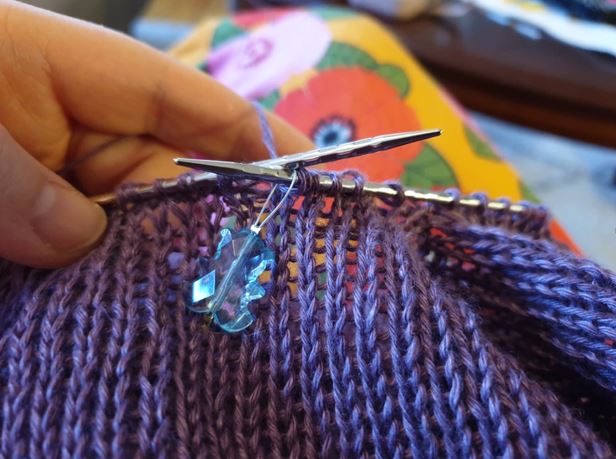Jag börjar helt enkelt med att dra på maskorna på stickan genom att bara koppla ihop min Scoubidou-tråd med min sticka. Jag börjar mitt under ärmen och mitt på de avmaskade maskorna och plockar sedan upp maskor enligt mönstret.