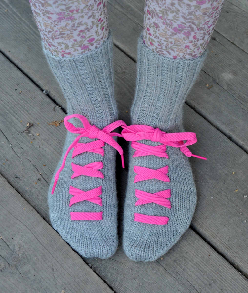 Denna idé är extra smart om du har sockor i gömmorna som du tröttnat på… Med hjälp av ett par roliga skosnören kan de få nytt liv! Sedan kan du kvällsmysa i soffan i dina alldeles egna ”ragg-sneakers”!