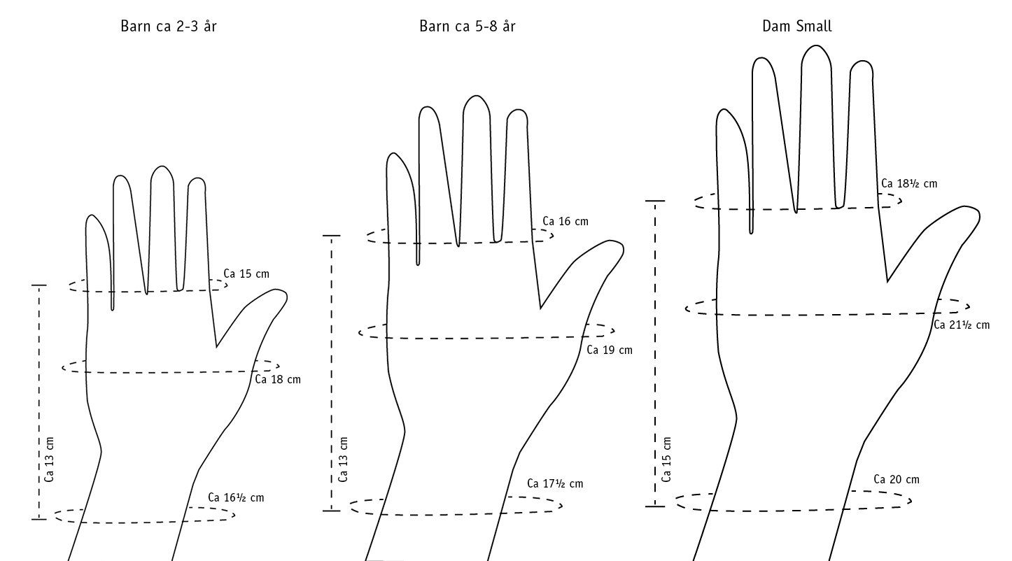 För att få rätt storlek, mät din hand enligt skissen nedan. Beskrivningen ger 3 storlekar: Barn ca 2-3, 5-8 år och dam S.