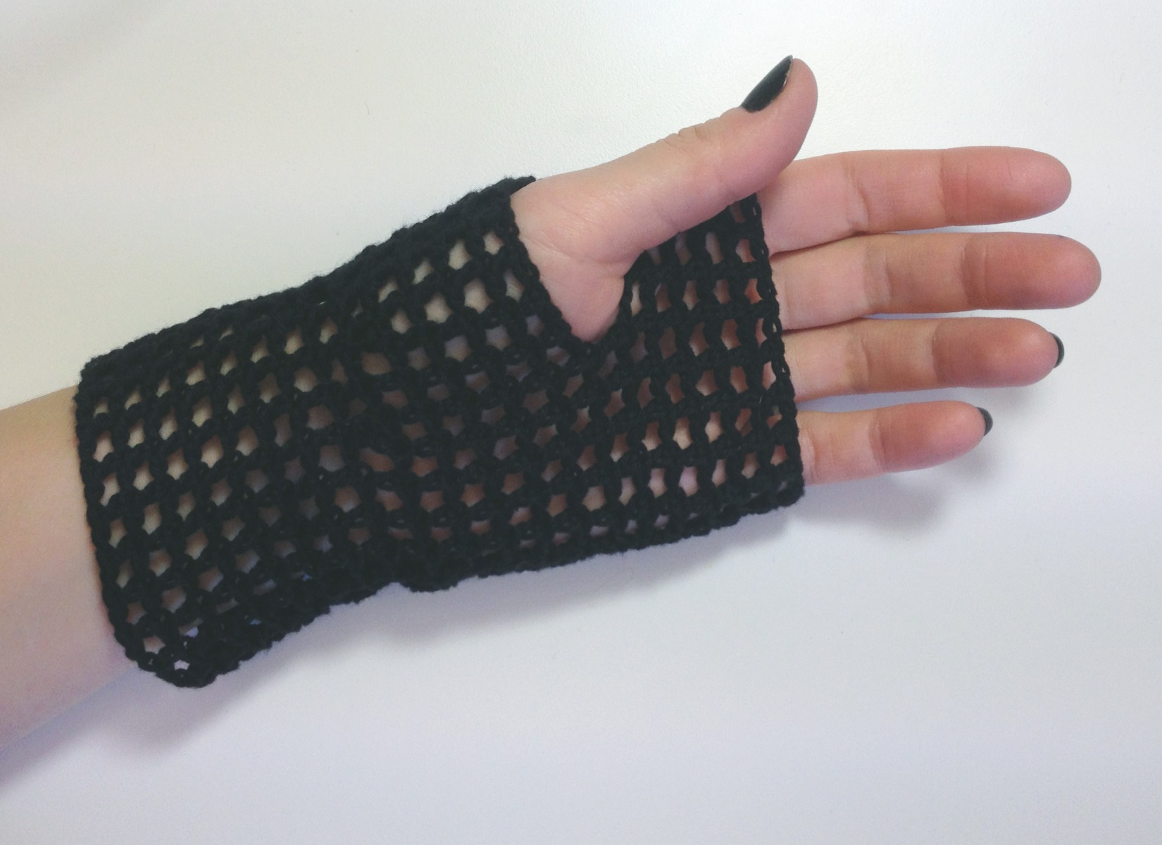Förklaringar: 2 st tills=Omslag, nedtag i m, hämta garn (=3 m på nålen), omslag, dra garnet genom 2 m (= 2 m på nålen), omslag, nedtag i nästa m, hämta garn (= 4 m på nålen), omslag, dra garnet genom 2 m (= 3 m på nålen), omslag, dra garnet genom resterande 3 m (= 1 m på nålen). 1 ruta= 1 lm, hoppa över nästa m, 1 st i nästa m. 1:a rutan på alla varv= 4 lm, hoppa över nästa m, 1 st i nästa m. OBS! Sluta alla varv med 1 sm i 1:a rutans 2:a lm. Virka rutor runt handsken utom i döskallemotivet. Handskarna virkas utifrån fingrarna in mot handen.