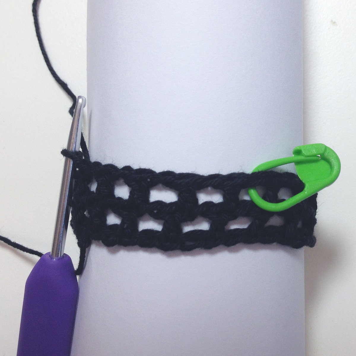 Varv 3: Virka 2 (3) 3 rutor (fram till 1 ruta innan markören, se bild), virka 9 lm, hoppa över 2 st, 1 st i nästa st och fortsätt med rutor varvet runt.