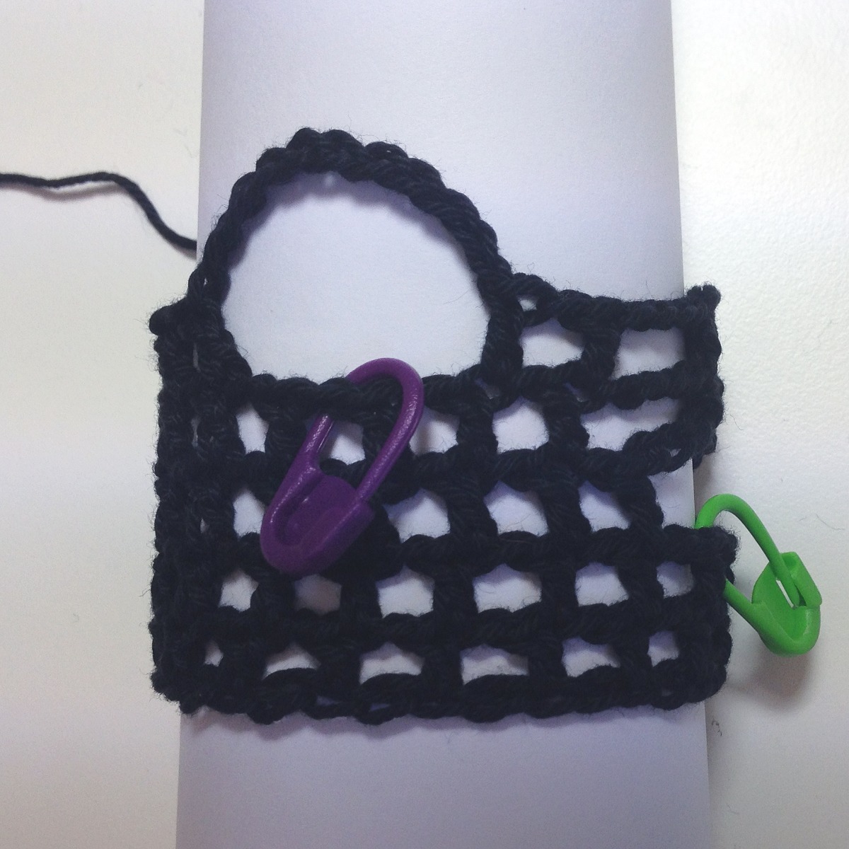 Markören = mitten av döskallemotivet/ovansidan av handsken (virkar du större så sätt markören i mitten av handskens ovansida, sedan anpassar du motivet så de 9 lm på varv 3 hamnar mitt för markören).