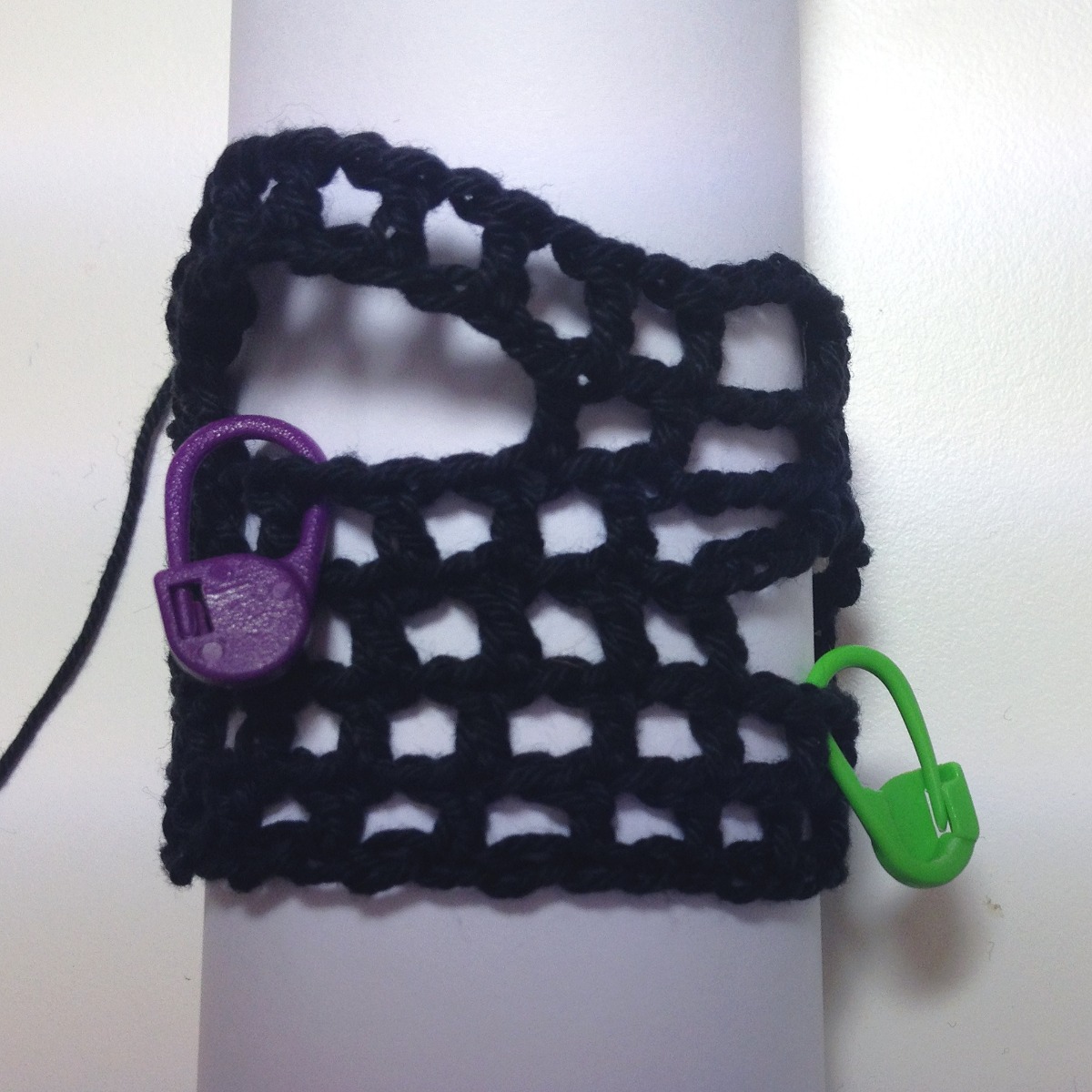 Varv 5: Virka 2 (2) 2 rutor, sedan 4 lm, 1 hst i 1:a hst på föreg varv, 2 hst i nästa och 1 hst i nästa, 4 lm, 1 st i nästa st, 1 (1) 2 rutor. Tumme: 11 (11) 13 lm, hoppa över 2 st, 1 st i nästa st, fortsätt virka rutor varvet runt.