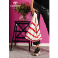 Väska med randning i 3 färger. Kassen rundstickas nerifrån och upp och handtagen stickas fram och tillbaka. Modellens form är inspirerad av en klassisk plastkasse.