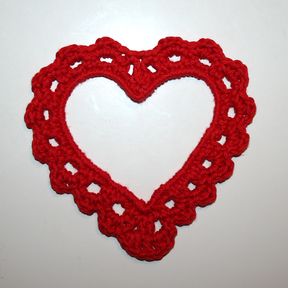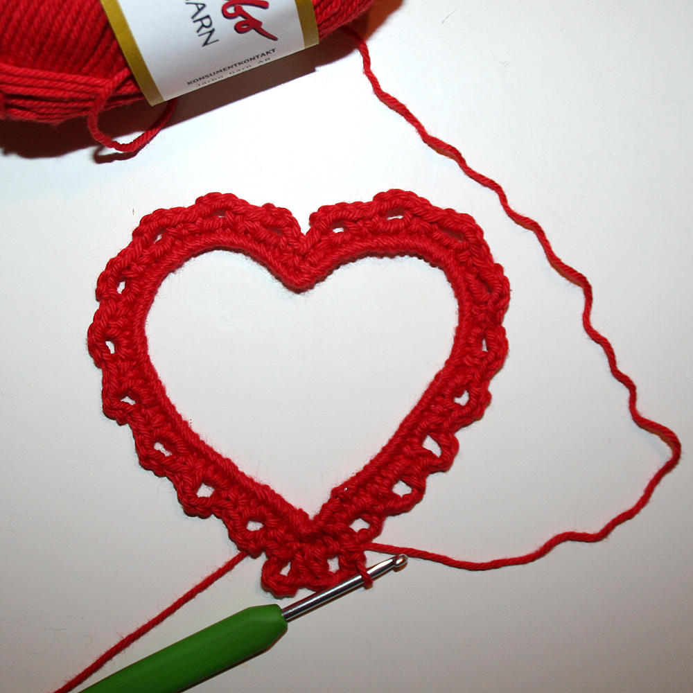Varv 1: Börja nedtill i hjärtats spets. Virka fasta maskor runt halva stommen. Skjut ihop dem tätt så maskorna döljer stommen. Räkna maskorna. Virka lika många maskor över andra halvan ner tillbaka till spetsen. Virka 3 fm över spetsen. Det ska vara en fm i mitten på spetsen.