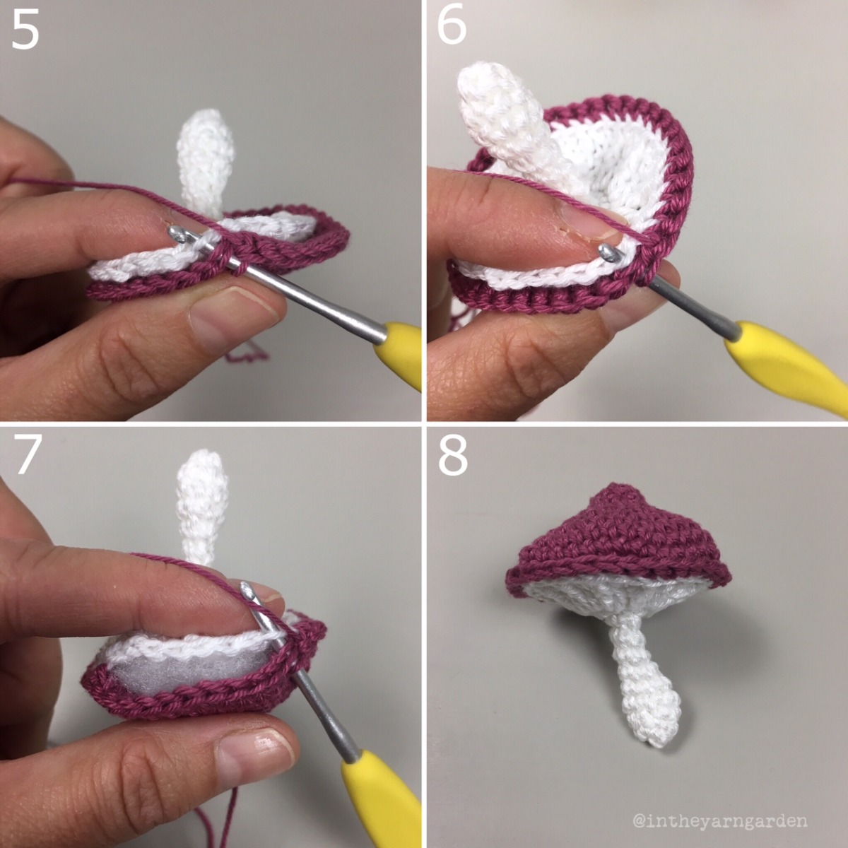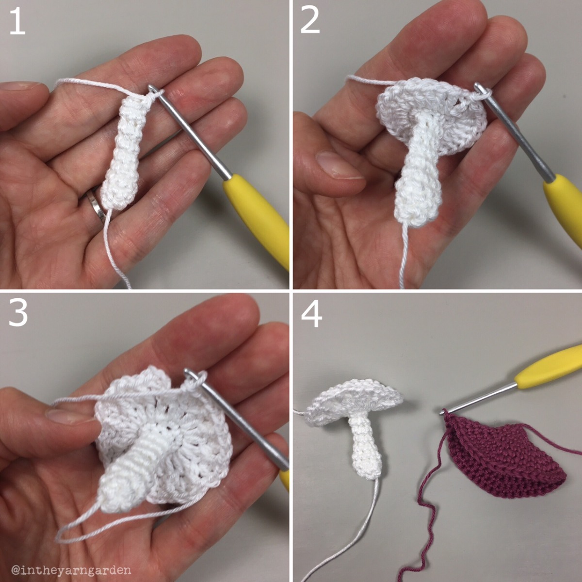 Varje svamp virkas i två delar, fot och hatt. Under sista varvet av hatten virkas hatten och foten samman.