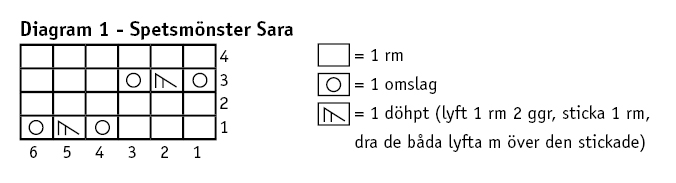 Varv 4-11/15: Sticka 0 (1) 2 rm, sedan spetsmönster Sara över 24 m, rm varvet runt.