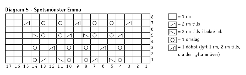 Varv 3: (1 vr rm, 1 am) 2 (2) 3 ggr, 0 (1) 0 am, spetsmönster Emma över 17 m, 1 (2) 1 am, (1 vr rm, 1 am) varvet runt.