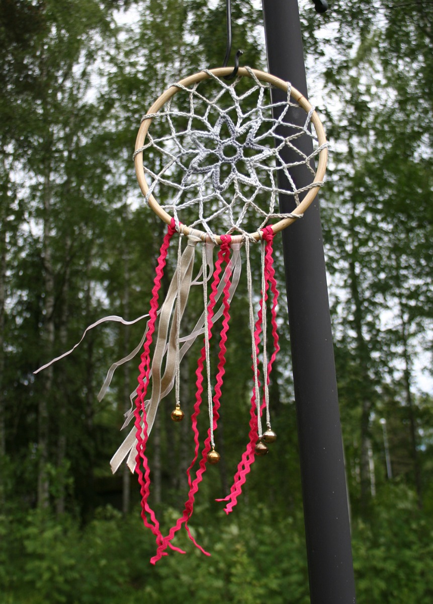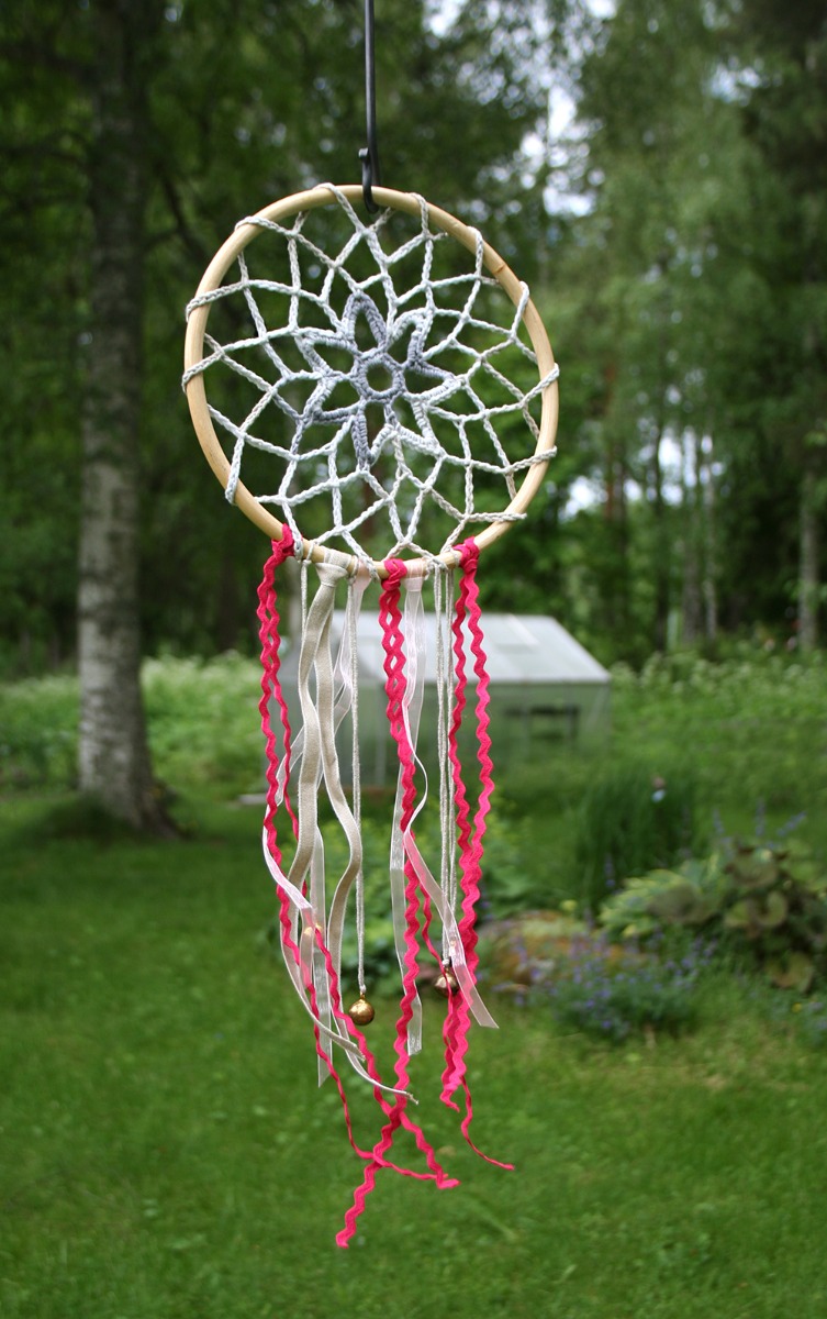 Dekorera nederdelen av träringen med band och pinglande föremål efter tycke och smak. Virka en ögla eller använd något annat för upphängning.