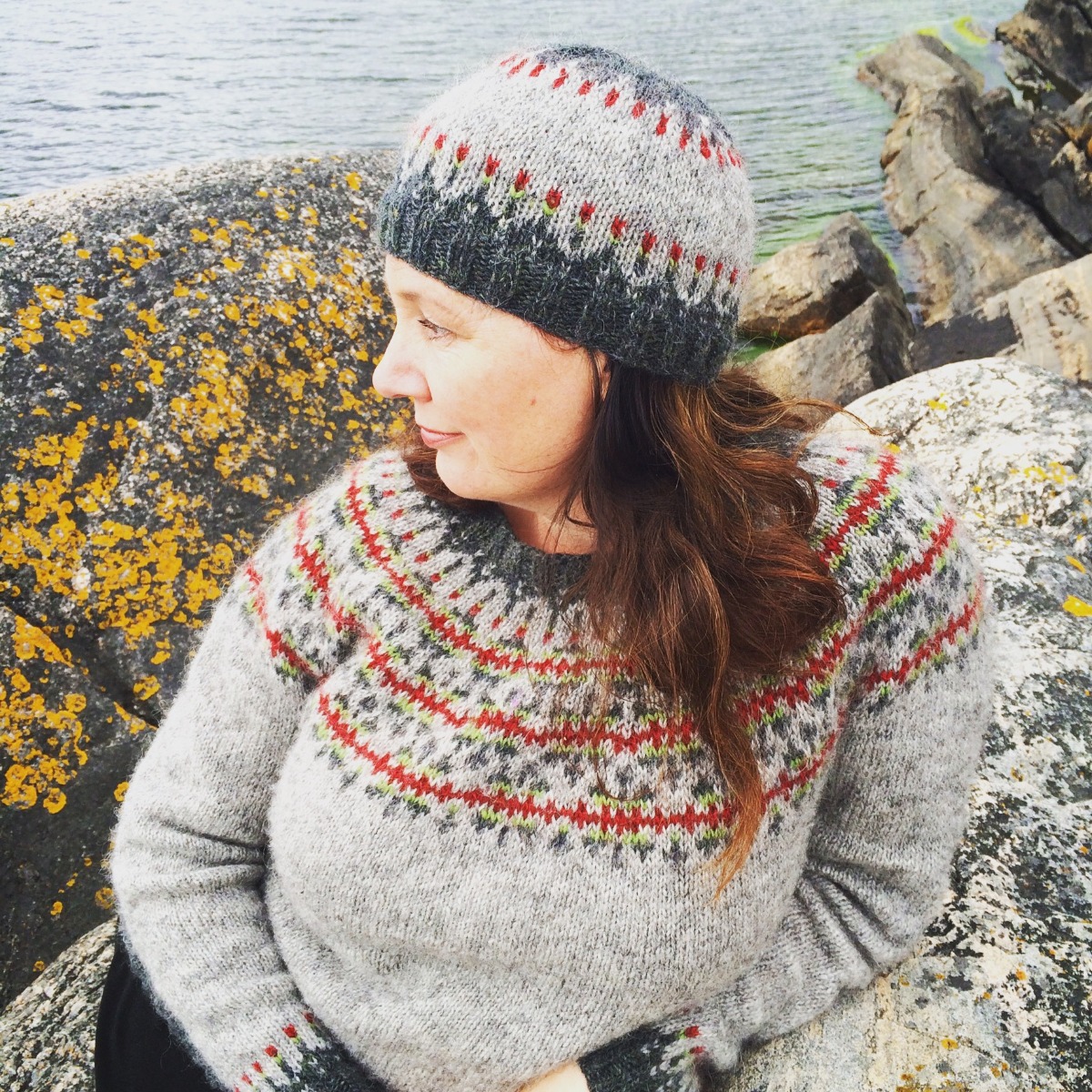 Och den här andra gången passar tröjan perfekt. Jag tvättar den försiktigt för hand och lägger ut den för att torka. Det är så vackert med det grova men ändå mjuka och lätt melerade garnet. Den känns som en del av naturen, klipporna, himlen och träden. Tvätten gör tröjan mjukare och jag blir så där barnsligt förtjust i min egen tröja att jag bara vill sitta och titta på den. Medan den torkar ute i vårvinden stickar jag en mössa i restgarnerna, lite på måfå. Sen är jag glad att vårvärmen avstannat så jag får gå runt i världens skönaste tröja. För den där 32 år gamla älsklingströjan har fått en konkurrent som säkert kommer slitas på i många år framöver. Om jag använder den lika länge som den förra kommer jag att gå runt i min Ásta Sóllilja när jag är 77 år. Det känns intressant att fundera på.