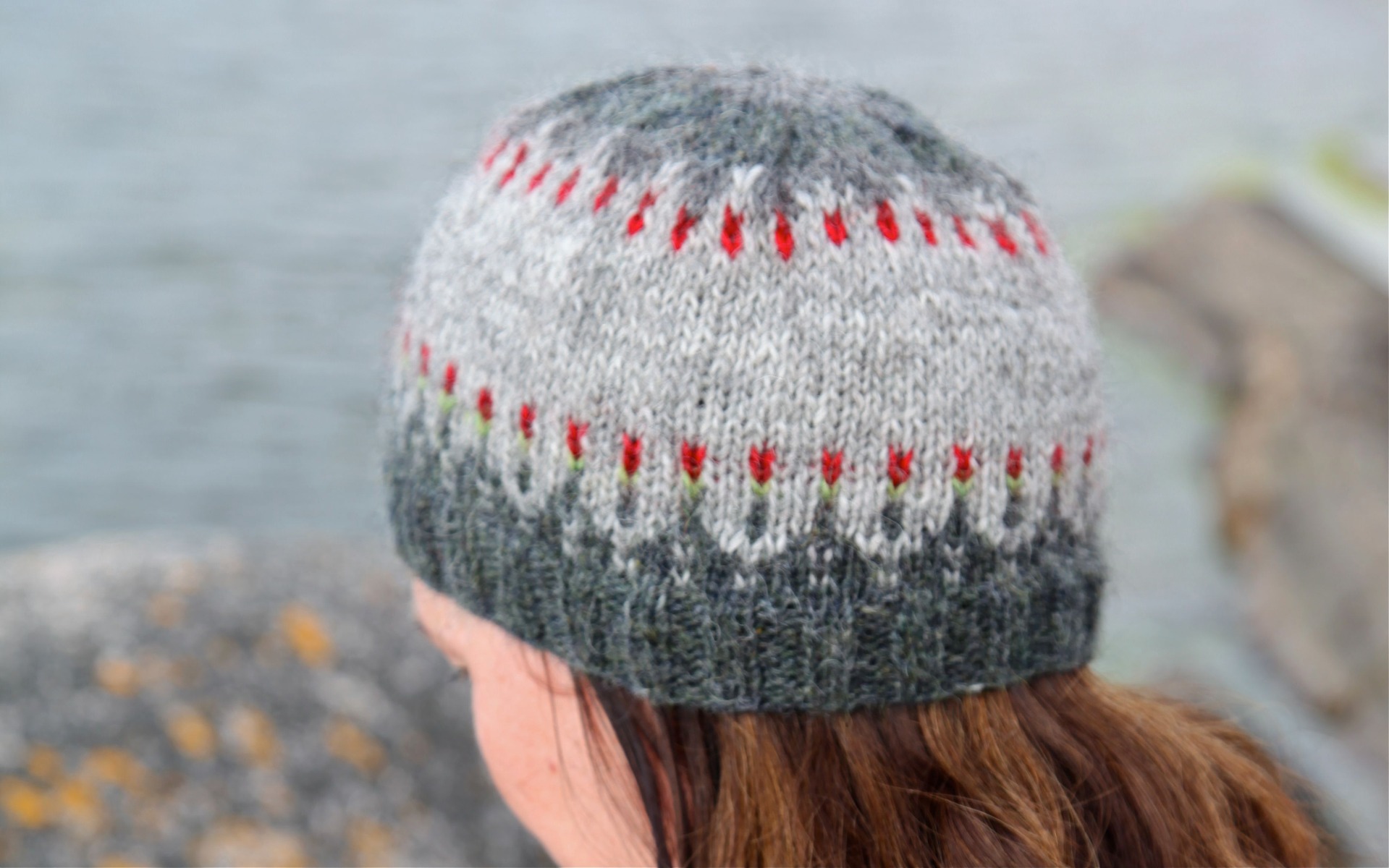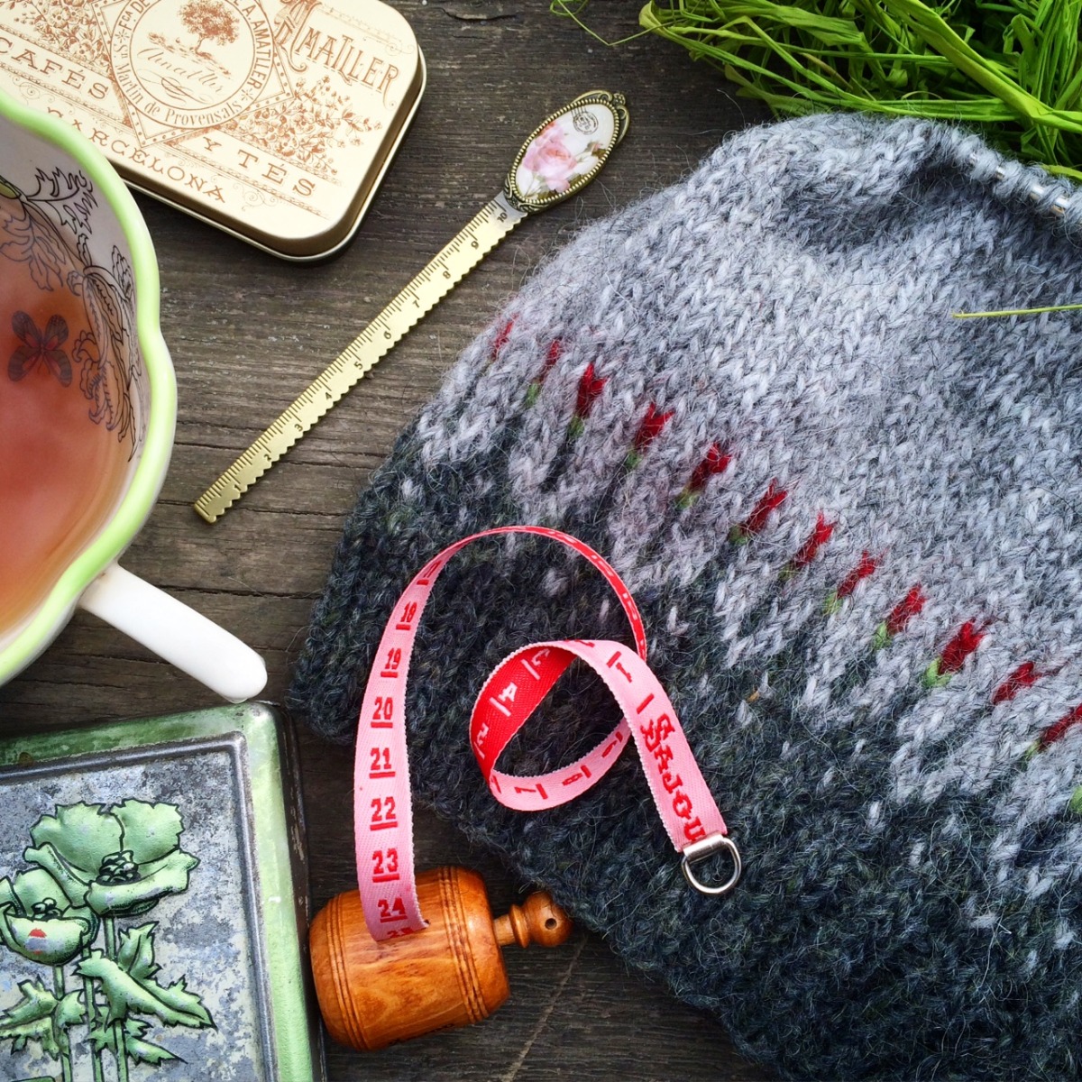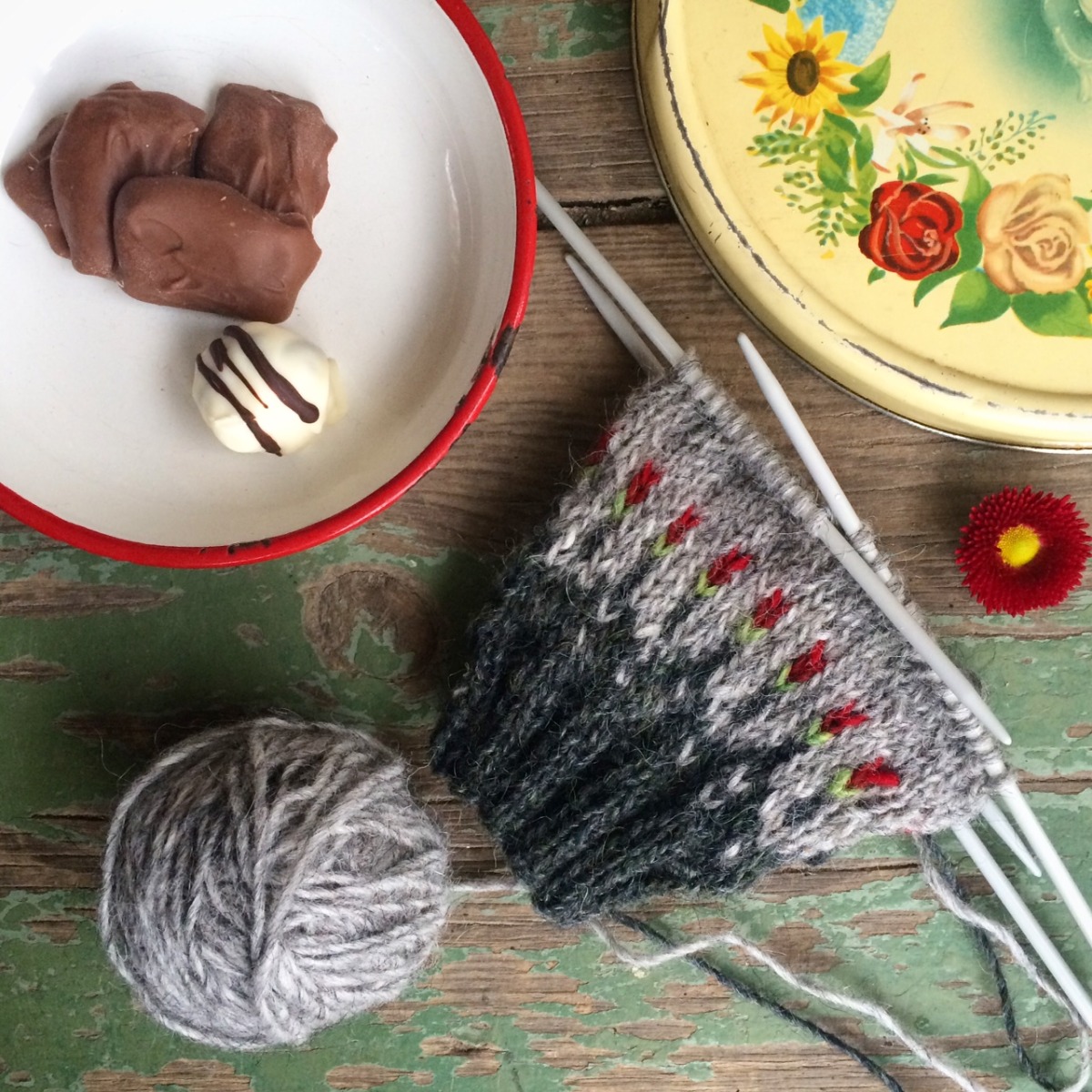 Kate Davies Ásta Sóllilja är ljust grå med mönsterstickning i två gulorange toner och två blå toner. Jag väljer att göra min i en lite mörkare nyans grå som jag fortfarande tycker är ljusgrå, de blå tonerna byter jag ut mot gröna och de gulorange mot röda. Jag tycker om att använda mig av komplementfärger när jag kombinerar färger och mönster. Rött och grönt framhäver varandra lika fint som blått och orange gör. Och jag fastnar på något vis alltid för gröna och röda kulörer.