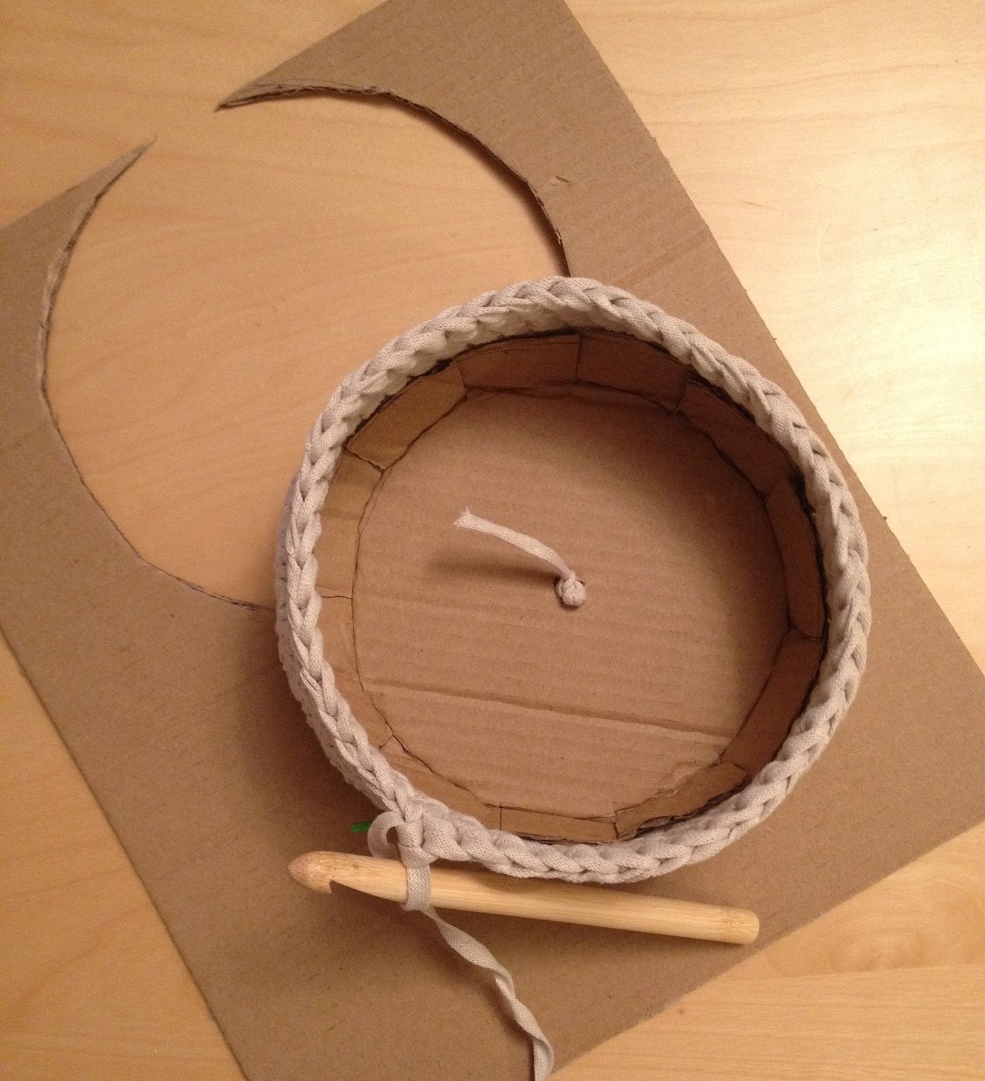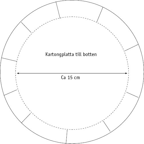För att få en stadig botten: Klipp till en kartongplatta enligt skissen nedan. Gör ett hål i mitten, klipp jack runtom en bit in och vik upp kanterna. Trä uppläggningstråden igenom hålet och placera kartongen i botten på arbetet, se bild nedan. Knyt några knutar i garnet för att spänna botten mot kartongen.