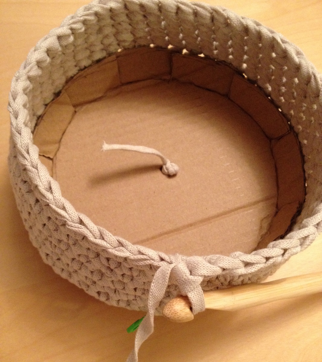 Gör en magisk ring med 6 fm i beige garn. Lämna en bit tråd som ska användas till kartongen senare.